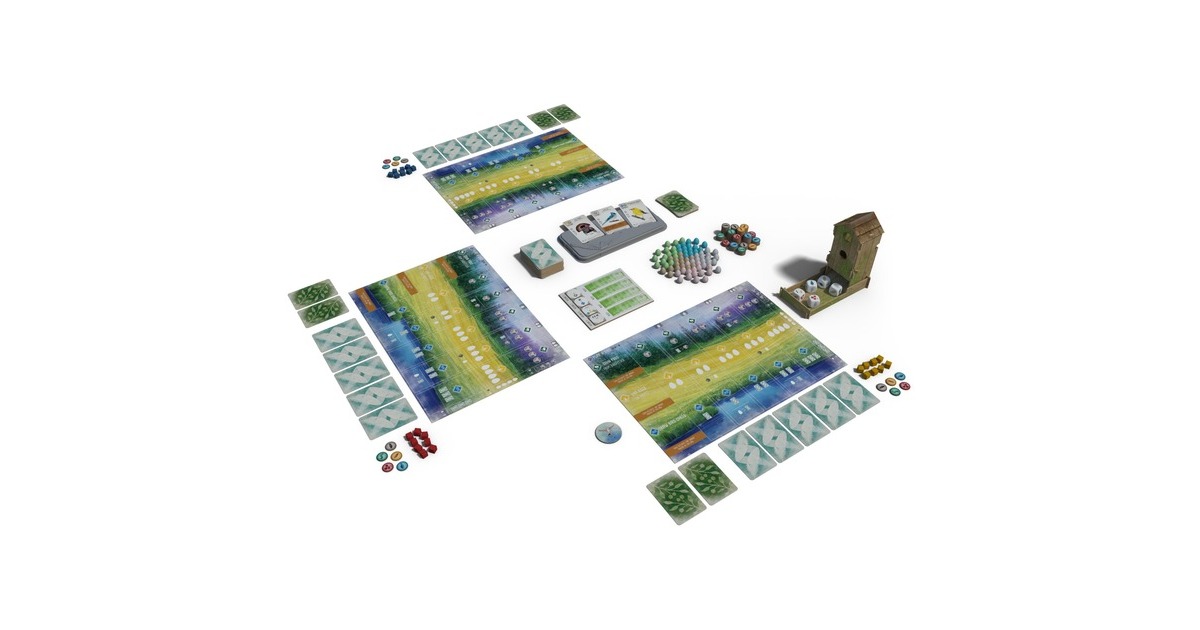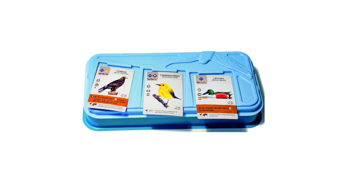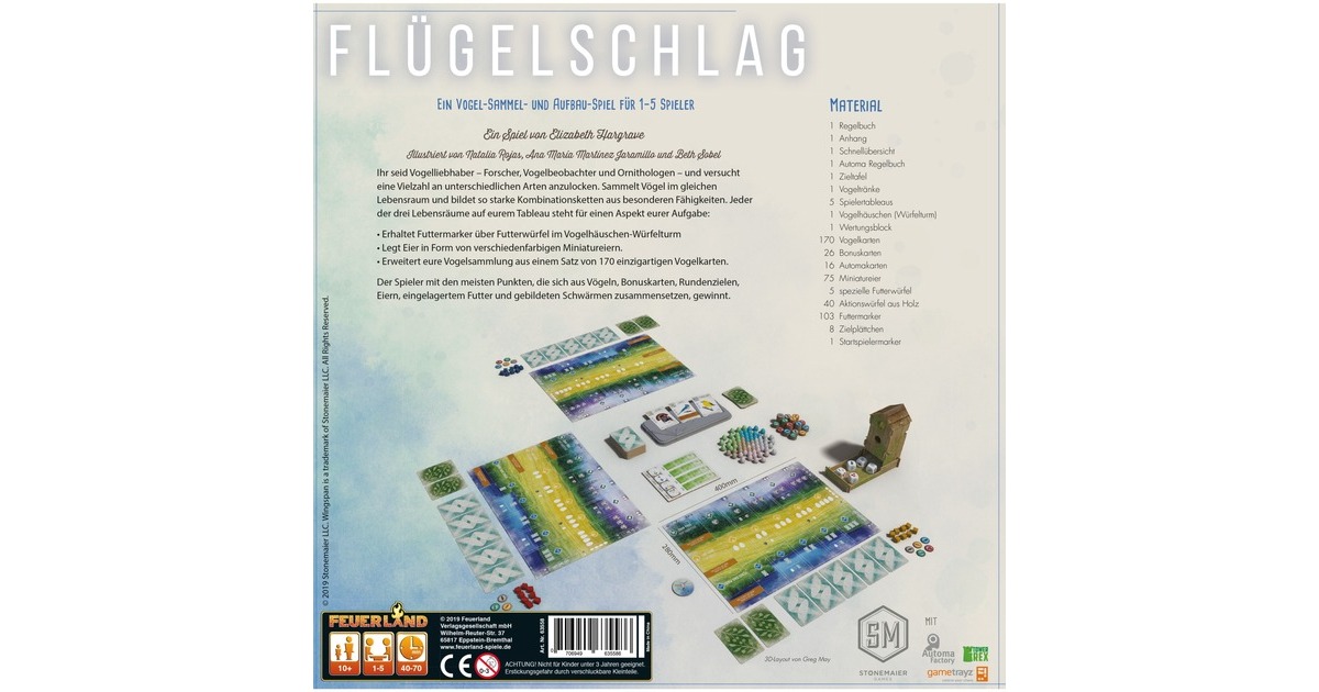 170 Vogelkarten bilden den Kern des Spieles Flügelschlag. Die Spieler sammeln diese Karten und versuchen daraus starke Kombinationsketten auf ihren Spieltableaus zu legen. Drei verschiedene Lebensräume stehen für drei Kombinationsketten, die gebildet werden können und die bei Aktivierung unterschiedliche Aktionen auslösen. Wechselnde Rundenziele, Bonuskarten und nicht zuletzt die illustrierten 170 Vogelkarten machen das Spiel dauerhaft abwechselungsreich. Die Austattung der Spielertableaus, Kartenablage, Miniatureier und einem Vogelhäuschen als Würfelturm ist sehr opulent.Art.-Nr.: 1555742