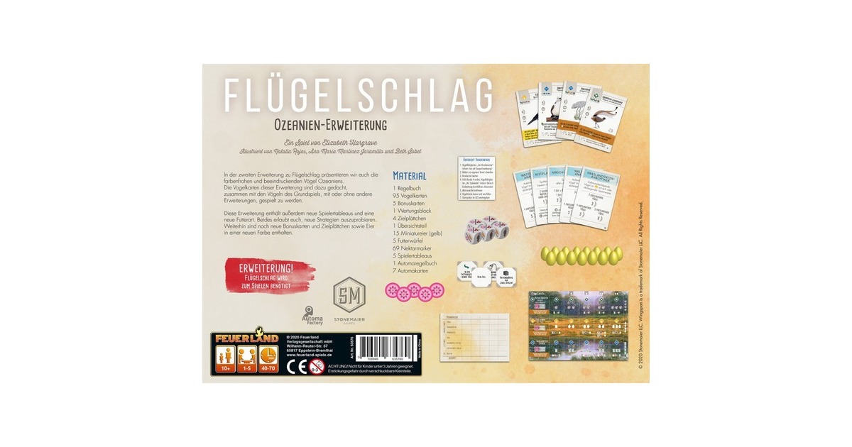 Die zweite Erweiterung zu Flügelschlag, dem Kennerspiel des Jahres 2019, präsentiert die farbenfrohen und beeindruckenden Vögel Ozeaniens. Sie enthält 95 neue Vogelkarten, eine neue Futterart (Nektar) mit neuen Futterwürfeln und neue Spielertableaus. Alles lässt sich mit dem Grundspiel und/oder der Europa Erweiterung kombinieren und bietet wieder neue strategische Optionen.Art.-Nr.: 1691476