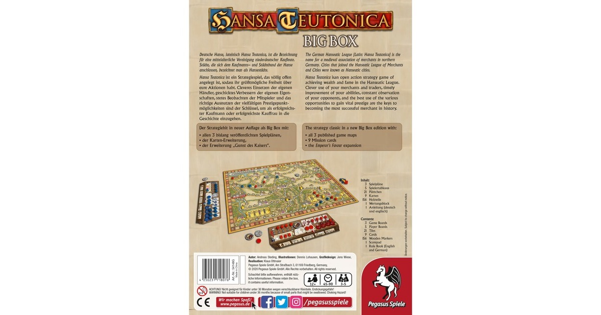 Deutsche Hanse, lateinisch: Hansa Teutonica, ist die Bezeichnung für eine mittelalterliche Vereinigung niederdeutscher Kaufleute. Städte, die sich dem Kaufmanns- und Städtebund der Hanse anschlossen, bezeichnet man als Hansestädte. Die Spieler versuchen ihr Ansehen als Kaufleute zu Zeiten der Hanse zu mehren. Dazu gibt es auf unterschiedliche Art und Weise Gelegenheit: In möglichst vielen Städten Niederlassungen zu gründen oder gar ein zusammenhängendes Netzwerk aufzubauen kann genauso Erfolg versprechend sein wie die eigenen Händlereigenschaften zu verbessern. Die Spieler führen während ihres Zuges Aktionen durch. So können sie ihre Händler auf dem Spielbrett einsetzen, versetzen oder gar gegnerische Händler verdrängen. Gelingt es ihnen, alle Verbindungspunkte zwischen zwei Städten zu besetzen, können sie eine Handelsroute einrichten und eine Niederlassung gründen. Bei manchen Städten darf ein Spieler, anstatt eine Niederlassung zu besetzen, eine seiner Eigenschaften weiterentwickeln. Dadurch kann er im weiteren Spielverlauf besser agieren. Es gewinnt am Ende der Spieler mit den meisten Prestigepunkten.Art.-Nr.: 1623281