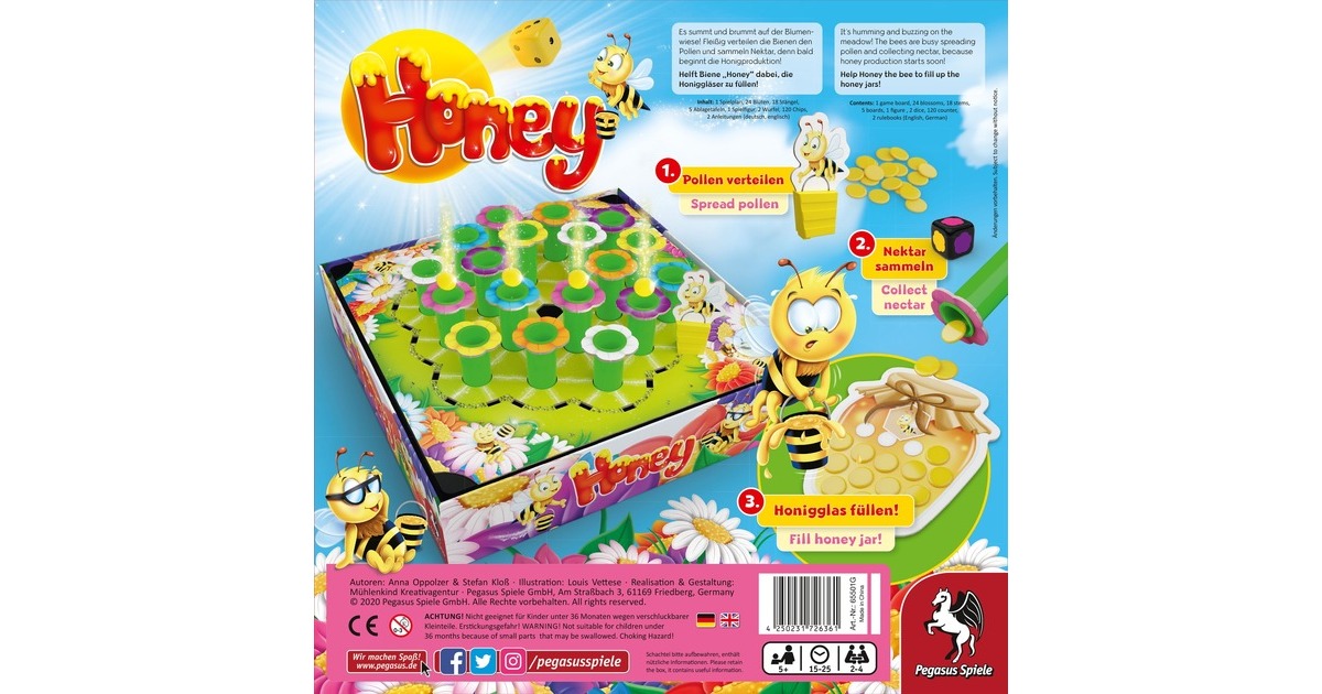 Vom Frühjahr bis zum Herbst sind die Honigbienen unterwegs, um Nektar zu sammeln und daraus leckeren Honig zu machen. Doch welche Blumen geben den meisten Nektar? Mit gutem Gehör und noch besserem Gedächtnis müssen die Spieler in Honey darauf achten, in welchen Blüten es das meiste zu holen gibt. Nur wer sein Honigglas schneller füllen kann als die Konkurrenz, erhält am Ende eine Auszeichnung durch die Bienenkönigin! In jeder Runde Honey wird durch die Position der Biene bestimmt, in welcher Blumenreihe neuer Nektar entsteht. Beim Hineinlegen der Nektartropfen können die Spieler hören, ob sich bereits ein oder mehrere Tropfen in einer Blüte befinden. Der Farbwürfel gibt vor, aus welche Blütenfarbe der aktive Spieler in dieser Runde ernten darf. Dabei versucht er natürlich so viel Nektar wie möglich einzusammeln. Wer sein Honigglas zuerst voll hat, gewinnt.Art.-Nr.: 1623420