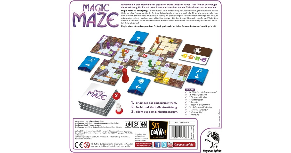 Was tun, wenn man keine Ausrüstung hat, um in dunklen Verliesen nach sagenumwobenen Schätzen zu suchen? Da bleibt nur eins: Dem örtlichen Magic Maze-Einkaufszentrum einen „Besuch“ abstatten. In einer Nacht-und-Nebel-Aktion schleichen sich daher ein Magier, ein Krieger, ein Elf und ein Zwerg in das Kaufhaus und suchen nach nützlichen Gegenständen für die nächste Dungeon-Expedition. Jeder Spieler kann zu jeder Zeit für einen der vier Helden eine Aktion durchführen, die nicht durch andere Spieler durchgeführt werden kann. Nur gemeinsam können sie das Labyrinth von Magic Maze erfolgreich überwinden, sich die Ausrüstung schnappen und zum Ausgang eilen, während die Sanduhr unerbittlich läuft. Das hört sich gar nicht so schwer an? Ach ja, die Spieler dürfen während des Spiels nicht miteinander reden, sondern sich nur in kurzen Phasen absprechen. Spannende Partien in unter 15 Minuten und abwechslungsreiche Szenarien sorgen für langanhaltenden Echtzeit-Spielspaß. Magic Maze von Kasper Lapp ist ein turbulentes Spiel für die ganze Familie, das alle gemeinsam zum Schweigen zwingt, aber zum Lachen bringt.Art.-Nr.: 1359932