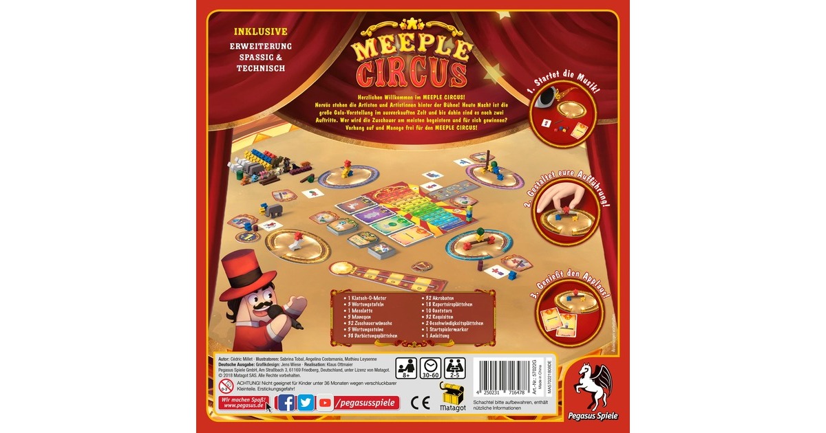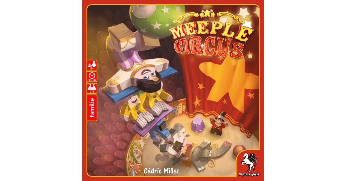 Herzlich Willkommen im Meeple Circus! Nervös stehen die Artisten hinter der Bühne! Heute Nacht ist die große Gala-Vorstellung im ausverkauften Zelt und bis dahin sind es noch zwei Auftritte. Wer wird die Zuschauer am meisten begeistern und für sich gewinnen? Über drei Runden sammeln die Spieler Akrobaten und Requisiten, um anschließend Auftritte mit ihnen vorzuführen. Eine App liefert dazu die passende Musik, die gleichzeitig die Zeit festlegt, in der die Spieler simultan ihre Darbietung aufbauen dürfen. Anschließend gibt es Punkte, wenn die Spieler die Wünsche der Zuschauer erfüllen und dabei auch noch schneller sind als ihre Konkurrenz. Nur in der dritten Runde – bei der Gala-Aufführung – bauen die Spieler ihre Darbietung reihum auf, denn hier haben die Zuschauer ganz außergewöhnliche Wünsche, deren Erfüllung von den Mitspielern kontrolliert wird. So muss ein Spieler sich zum Beispiel immer für Applaus während der Musik bedanken oder aufspringen, wenn in der Musik ein Becken ertönt. Wer am Ende der Partie den meisten Applaus ernten konnte, wird zum Star der Zirkuswelt. Meeple Circus macht die Spieler im Handumdrehen zu Zirkusartisten, die die abenteuerlichsten Darbietungen vorführen. Dabei müssen sie Akrobaten, Tiere und Requisiten geschickt stapeln bevor die Zeit abläuft. Besonders die letzte Runde hält ulkige Aufgaben für sie bereit, die von ihnen volle Aufmerksamkeit erfordert. Ein flottes Vergnügen, bei dem vor Lachen kaum ein Auge trocken bleibt.Art.-Nr.: 1623291