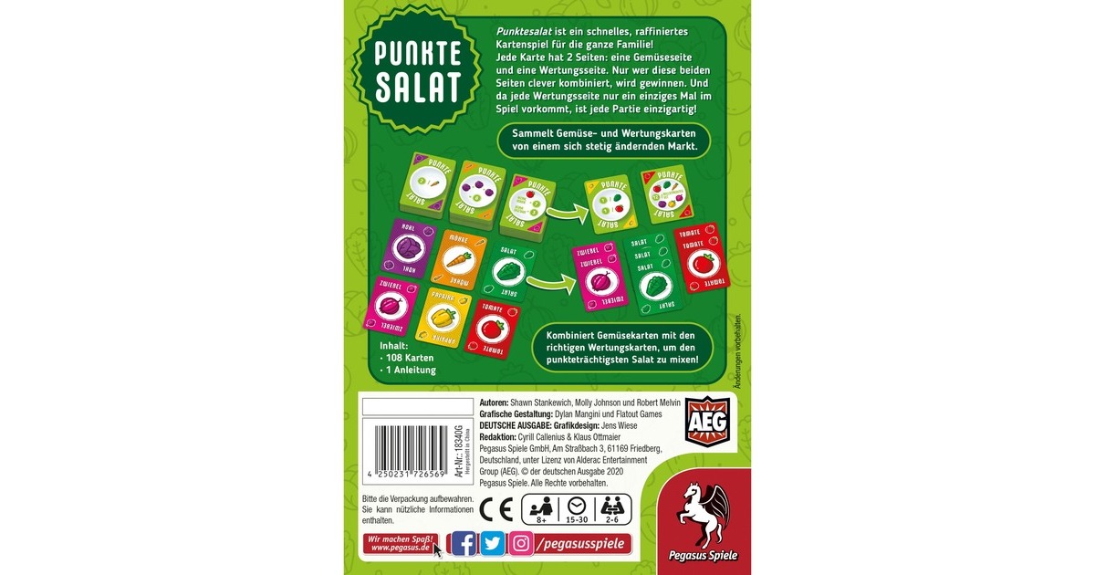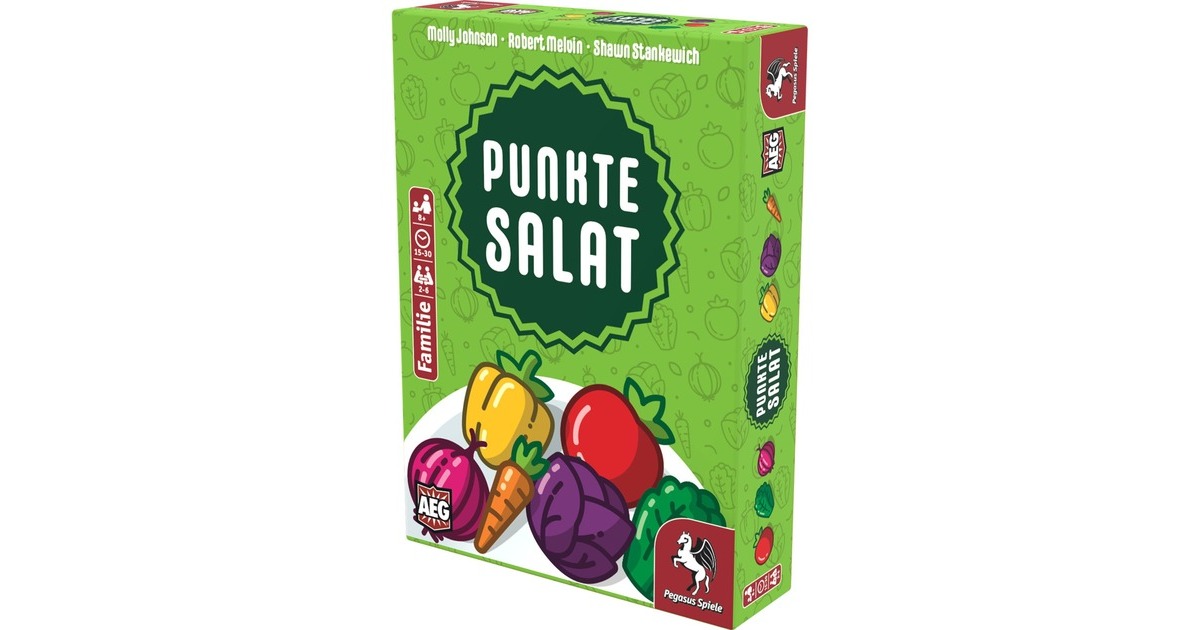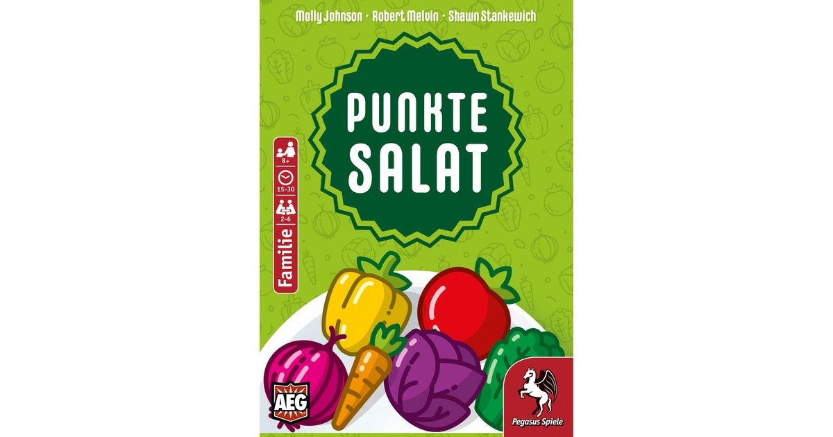 Punktesalat ist ein schnelles und spaßiges Drafting-Kartenspiel für die ganze Familie! Es gibt über 100 Wege, um Punkte zu sammeln, denn jede einzelne Karte zeigt auf einer Seite ein Gemüse und auf der anderen Seite eine Wertungsmöglichkeit. Die Spieler sammeln im Verlauf mehrerer Runden Gemüse und Punktekarten und versuchen dabei die erstmögliche Kombination zu kreieren. Diverse Strategien können zum Sieg führen und jede Partie ist einzigartig. Ist ein Spieler am Zug, darf er entweder zwei von sechs Gemüsekarten oder eine von drei Punktekarten aus dem offenen Angebot nehmen und in seine Auslage legen. Anschließend wird ggf. die Gemüseauslage aufgefüllt. Optional darf der Spieler einmal in seinem Zug eine Punktekarte umdrehen zu einer Gemüsekarte, aber niemals andersrum. Das Spiel endet, wenn alle Karten gedraftet wurden. Wer nun die beste Kombination aus Gemüse- und Wertungskarten besitzt, gewinnt.Art.-Nr.: 1623056