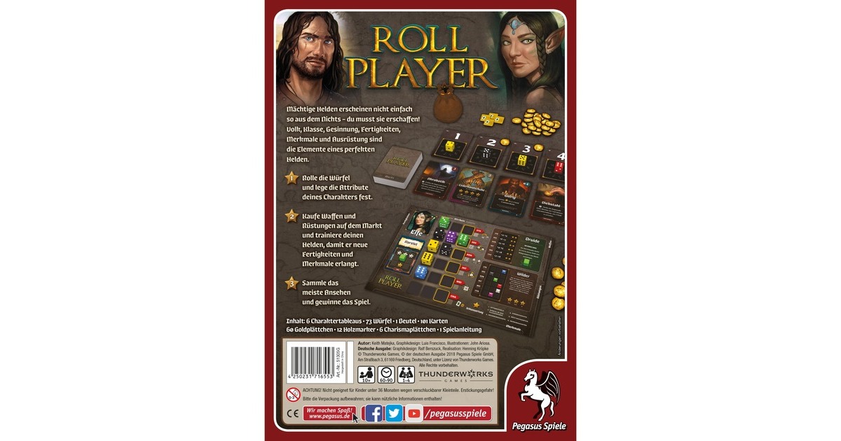Mächtige Helden erscheinen nicht einfach so aus dem Nichts – man muss sie erschaffen! Volk, Klasse, Gesinnung, Fertigkeiten, Merkmale und Ausrüstung sind die Elemente eines perfekten Helden, bereit sich allen Widerständen auf dem Weg zu Ruhm und Reichtum zu stellen. In Roll Player wetteifern die Spieler darum, den besten Abenteurer zu erschaffen, der jemals gelebt hat, und bereiten ihn auf eine epische Reise vor. Jede Runde werden farbige Würfel geworfen und von den Spielern ausgewählt, um die Attribute ihres Charakters zu verbessern. Mit Gold können sie Waffen und Rüstungen für ihre Helden kaufen. Durch Training erlangen die Helden bessere Fertigkeiten. Prägende Merkmale runden ihn ab. Indem die Spieler den perfekten Helden formen, sammeln sie Ansehen. Wer das meiste Ansehen erlangen kann, gewinnt das Spiel – dieser Held wird mit Sicherheit auch die größten Abenteuer triumphal meistern. Noch nie war die Erschaffung des eigenen Abenteurers so taktisch reizvoll und spannend wie in Roll Player. Jede Runde müssen die Spieler weitreichende Entscheidungen treffen, die ihren Helden permanent beeinflussen. Durch die zahlreichen Charaktermerkmale und Ausrüstungen ist jeder Held und jede Partie von Roll Player einzigartig.Art.-Nr.: 1551623