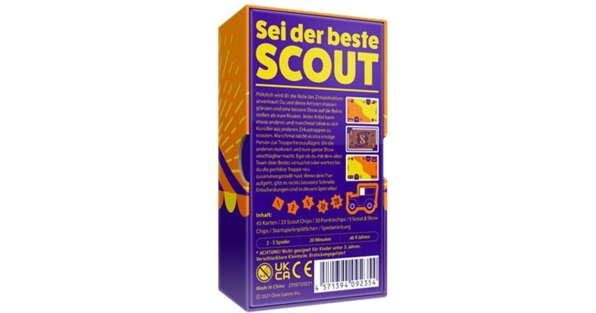 In Scout wird den Spielern plötzlich Rolle des Zirkusdirektors anvertraut. Sie und die Artisten müssen glänzen und eine bessere Show auf die Beine stellen als ihre Rivalen. Dazu müssen Karten mit gleichen oder aufeinanderfolgenden Zahlen auf einer Hand zusammengestellt werden, um eine spektakulärere Kombination als die Konkurrenz zu bilden und eine Show zu veranstalten. Dabei dürfen die Karten jedoch nicht neu angeordnet werden. Wenn eine Attraktion fehlt, müssen Artisten gescoutet werden, die eine entsprechende Darbietung leisten können. Manchmal reicht es dabei, einen einzigen Artisten zur Truppe hinzuzufügen, der die anderen motiviert und die ganze Show unschlagbar macht. Schnelle Entscheidungen sind dabei alles!Art.-Nr.: 1860030