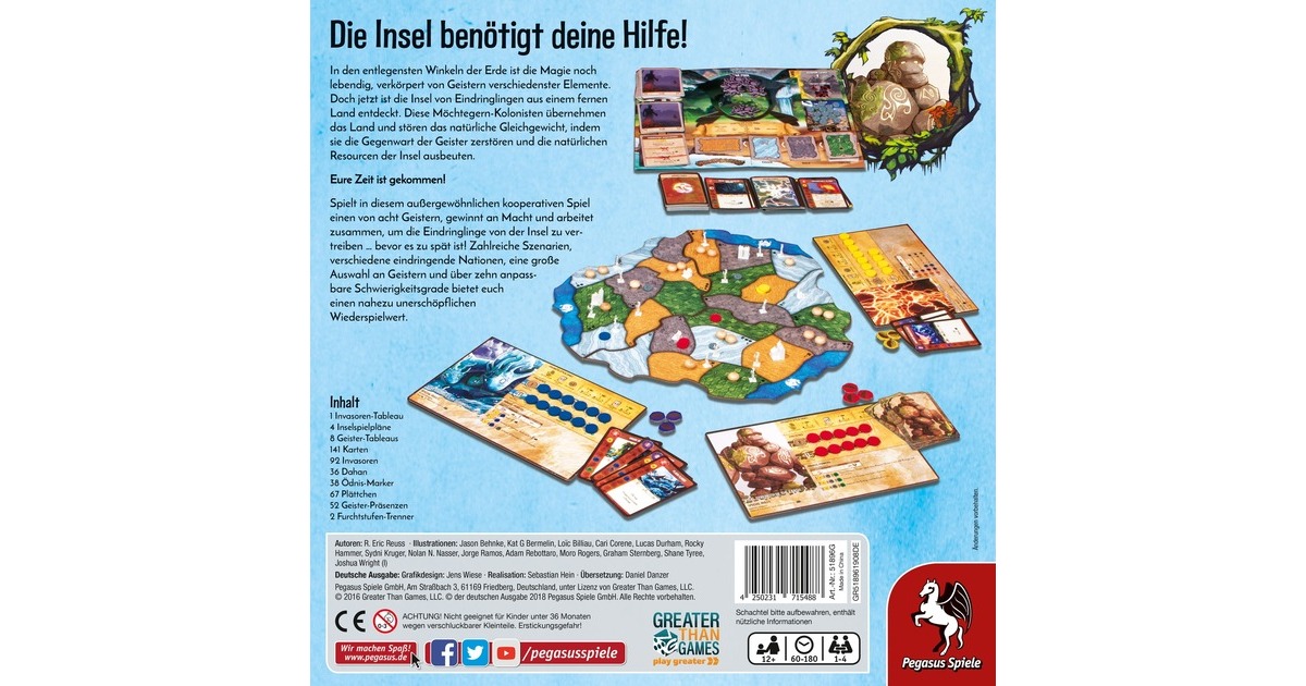In den entlegensten Winkeln der Erde ist die Magie noch lebendig, verkörpert von Geistern des Landes, der Luft und jedes anderen Elements. Als sich die kolonialen Territorien der Großmächte Europas weiter und weiter ausbreiten, erheben sie zwangsläufig auch irgendwann Anspruch auf Gebiete, in denen die Geister noch Macht besitzen – und sobald dies passiert, wird das Land selbst mit seinen Bewohnern gegen die Eindringlinge kämpfen. Im komplexen und thematischen Koop-Spiel Spirit Island übernehmen die Spieler die Rollen der Geister und müssen ihre Insel vor der Kolonialisierung durch die Eindringlinge beschützen. Jedem Geist stehen dazu andere Fähigkeiten zur Verfügung, doch nur Hand in Hand werden sie ihre Heimat verteidigen und ihren Präsenz halten können. Spirit Island dreht das Rezept bekannter Strategiespiele auf den Kopf: statt auszukundschaften, sich auszubreiten, auszubeuten und auszulöschen, geht es darum, selbiges zu verhindern. Dank einer großen Auswahl unterschiedlicher Geister, zahlreicher Szenarien und anpassbarer Schwierigkeitsgrade bietet dieses außergewöhnliche Expertenspiel einen nahezu unerschöpflichen Wiederspielwert.Art.-Nr.: 1623191