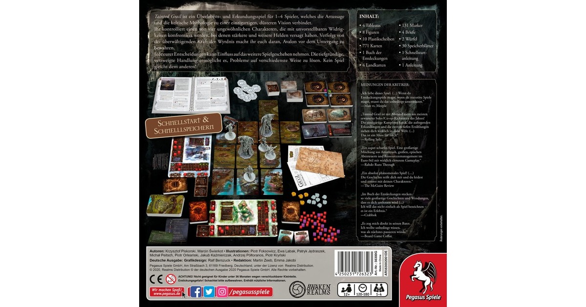 Tainted Grail ist ein Überlebens- und Erkundungsspiel, welches die Artussage und die keltische Mythologie zu einer einzigartigen, düsteren Vision verbindet. Die Spieler kontrollieren einen von vier ungewöhnlichen Charakteren, die mit unvorstellbaren Widrigkeiten konfrontiert werden, bei denen stärkere und weisere Helden versagt haben. Verfolgt von der überwältigenden Kraft der Wyrdnis machen sie sich daran, Avalon vor dem Untergang zu bewahren. Bei Tainted Grail wählt jeder Spieler einen der vier einzigartigen Charaktere, von denen jeder andere Startvoraussetzungen und Fähigkeiten besitzt. Als Gruppe und auch auf eigene Faust bereisen sie Avalon. Sie interagieren mit Bewohnern, erkunden geheimnisvolle Orte, sammeln Nahrung und Kämpfen gegen zahlreiche Feinde. Bei den Kämpfen und Diplomatie-Begegnungen kommt eine innovative Kartenmechanik zum Einsatz. Immer wieder lesen die Spieler Abschnitte aus dem Buch der Entdeckungen und treffen Entscheidungen, die das Spielgeschehen beeinflussen. Dabei kann es manchmal wichtig sein, welcher Charakter in diesem Moment dabei ist. Achtung: Dies ist die Retail-Edition von Tainted Grail. Die Figuren sind unbehandelt.Art.-Nr.: 1623290