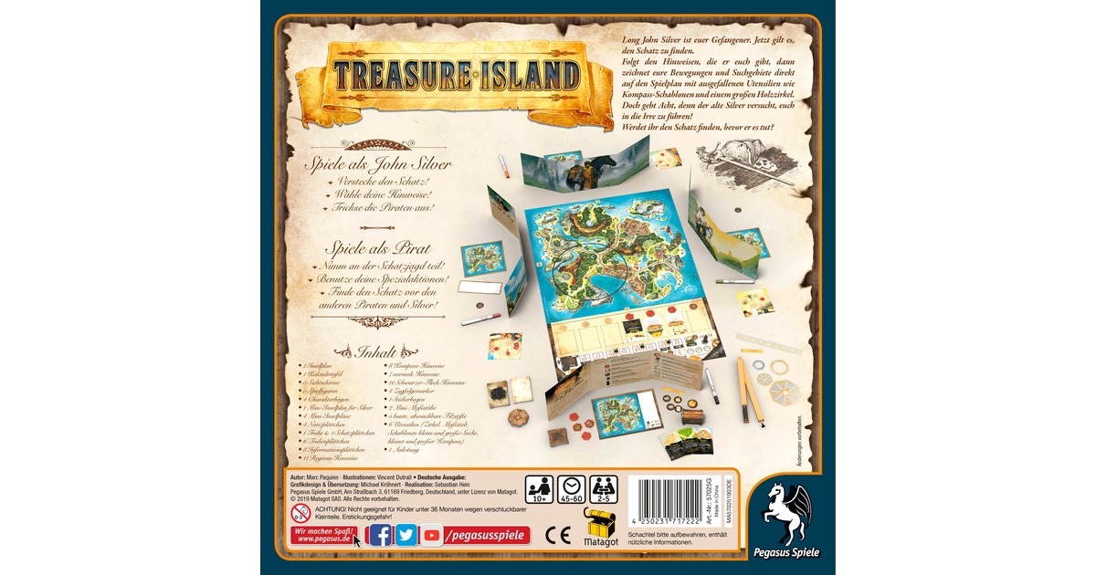 Der berüchtigte Pirat Long John Silver sitzt im Gefängnis. Das ist die Chance! Jetzt gilt es, seinen Schatz zu finden. In Treasure Island müssen die Spieler den Hinweisen von Silver folgen. Dazu zeichnen sie ihre Bewegungen und Suchgebiete direkt auf den Spielplan mit fantastischen Utensilien wie Kompass-Schablonen und einem großen Holzzirkel. Doch aufgepasst, denn der alte Silver versucht, die Spieler in die Irre zu führen. Wird einer der Spieler den legendären Schatz von Captain Flint finden, bevor Silver entkommt und ihn selbst heben kann? In jeder Partie schlüpft ein Spieler in die Rolle von Silver und kann ein neues Versteck für den Schatz auswählen. Wer die Schatzinsel gelesen hat, der weiß, dass Silver am Ende mit einem Teil des Schatzes entkommen konnte. In Treasure Island erfahren die Spieler endlich, was aus ihm und seinem Schatz geworden ist. Dabei erleben sie ein spannendes Wettrennen mit einzigartigen Mechanismen und Komponenten.Art.-Nr.: 1623306
