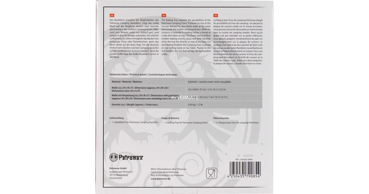 Das Backblech für den Petromax Camping-Backofen ist eine unverzichtbare Ergänzung, um knusprige Frühstücksbrötchen und Pizzen zuzubereiten. Durch die kluge Führung von Unter- und Oberhitze entstehen perfekte Backergebnisse unterwegs mit dem Camper oder Van und überall dort, wo kein Backofen vorhanden ist. Die seitliche Luftführung, entwickelt in der Petromax Drachenwerkstatt, sorgt für eine Luftzirkulation wie im heimischen Backofen. Einfach das Backblech auf der Basisform platzieren und die optimale Hitze erhalten. Mit dem runden Pizzablech aus Edelstahl kann man in Kombination mit dem Camping Backofen auch zwei Gerichte gleichzeitig zubereiten: Auf dem Blech überbacken knusprige Nachos, während unten bereits das feurige Chili köchelt. Mit den beiden seitlichen Henkeln wird die Pizza direkt mit dem runden Blech serviert.Art.-Nr.: 1883438