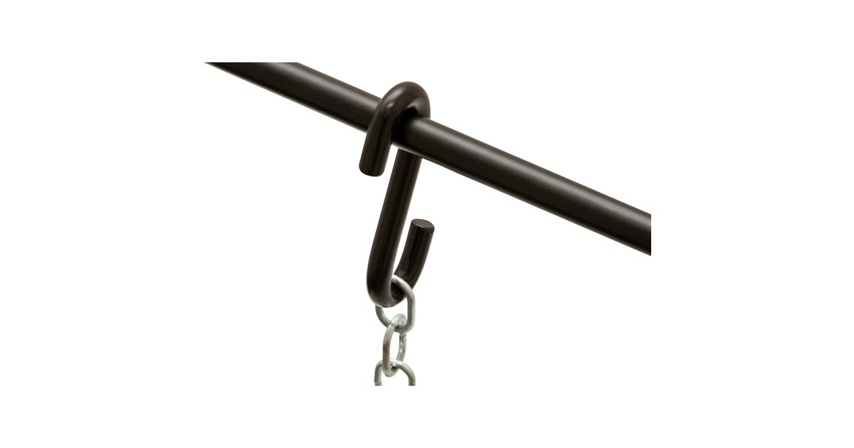 Stahlstangen (pulverbeschichtet), maximale Länge der Kette für den Grillrost: 63,5cm, 5 Haken (2x 13,5cm, 20cm, 33cm, 43cm) |