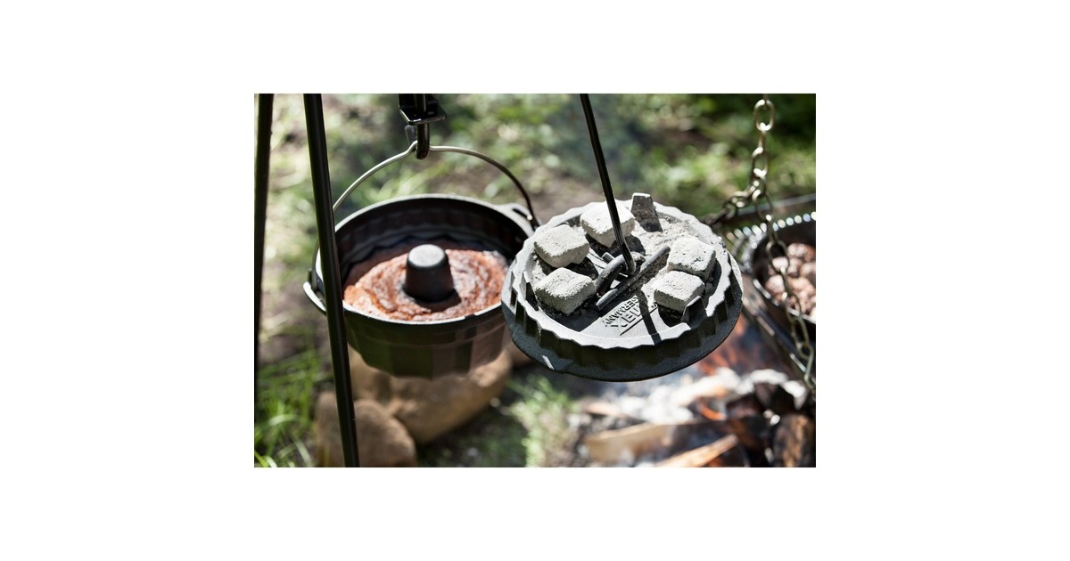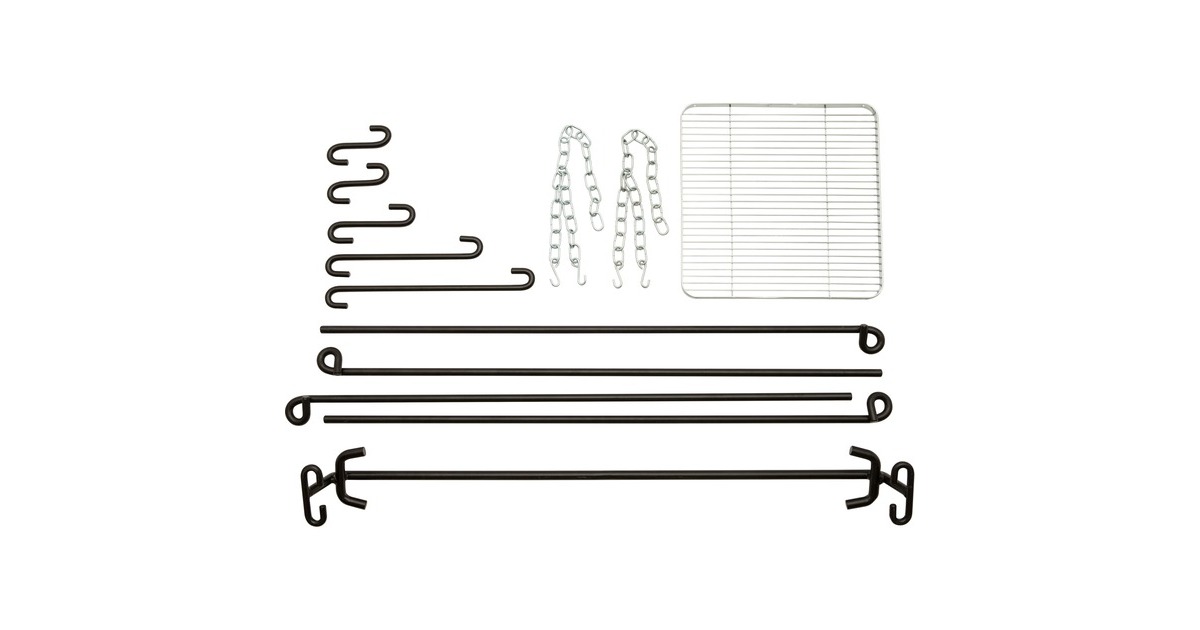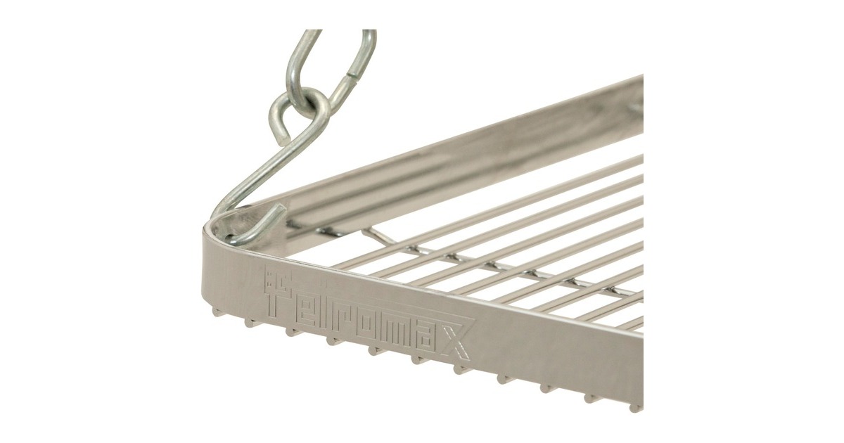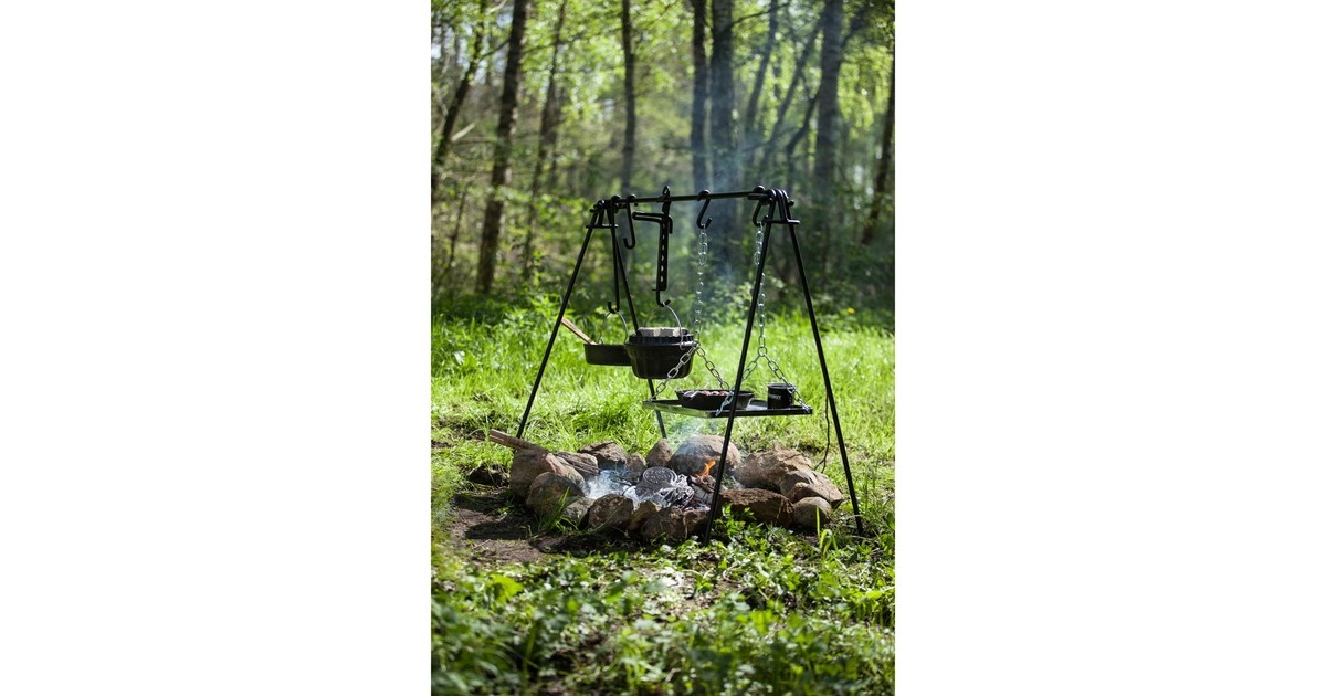 Die praktische Kochstelle wird mit einer 115cm langen Querstange, einem Grillrost mitsamt höhenverstellbarer Kettenaufhängung sowie drei Haken unterschiedlicher Länge für das Anhängen von Kochgeschirr geliefert. Die lange Querstange ermöglicht das Kochen über einer oder mehreren Feuerstellen. Der Grillrost mit umlaufend erhöhtem Rand hält das Grillgut sowie Pfannen und Co. sicher an ihrem Platz. |