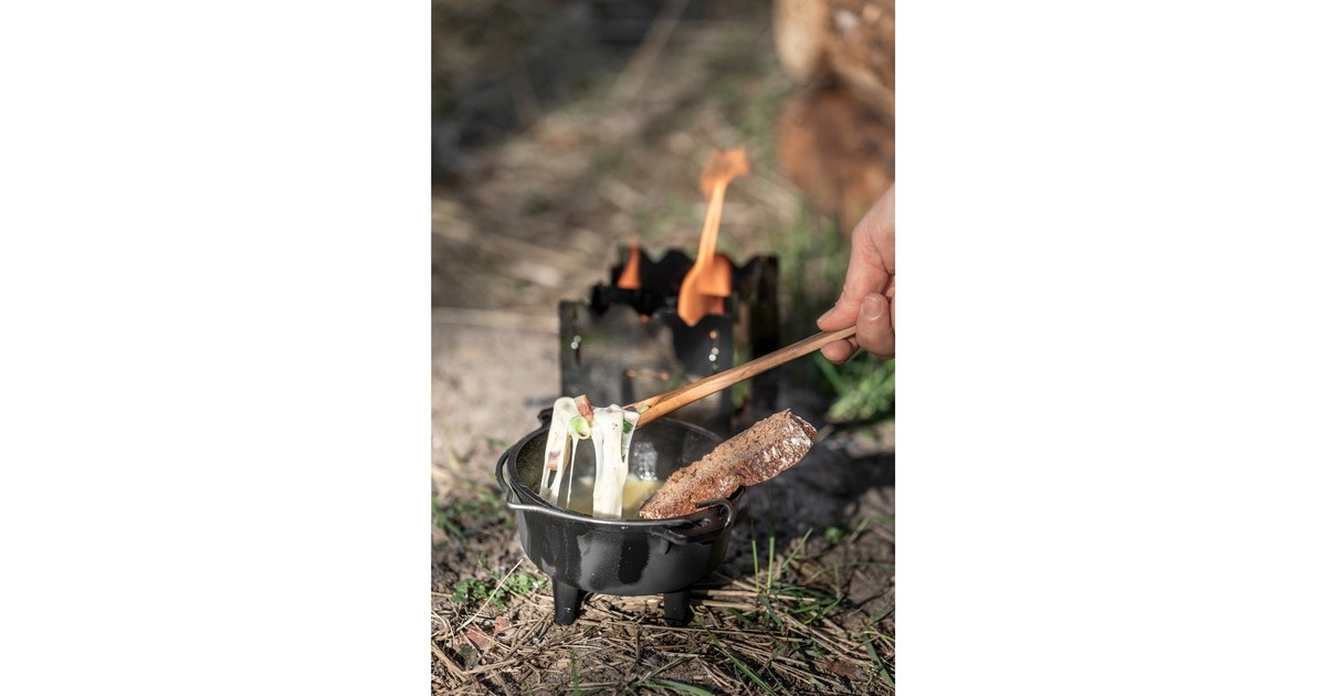 Sicheres Aufhängen am Lagerfeuer durch Einkerbung am Henkel |