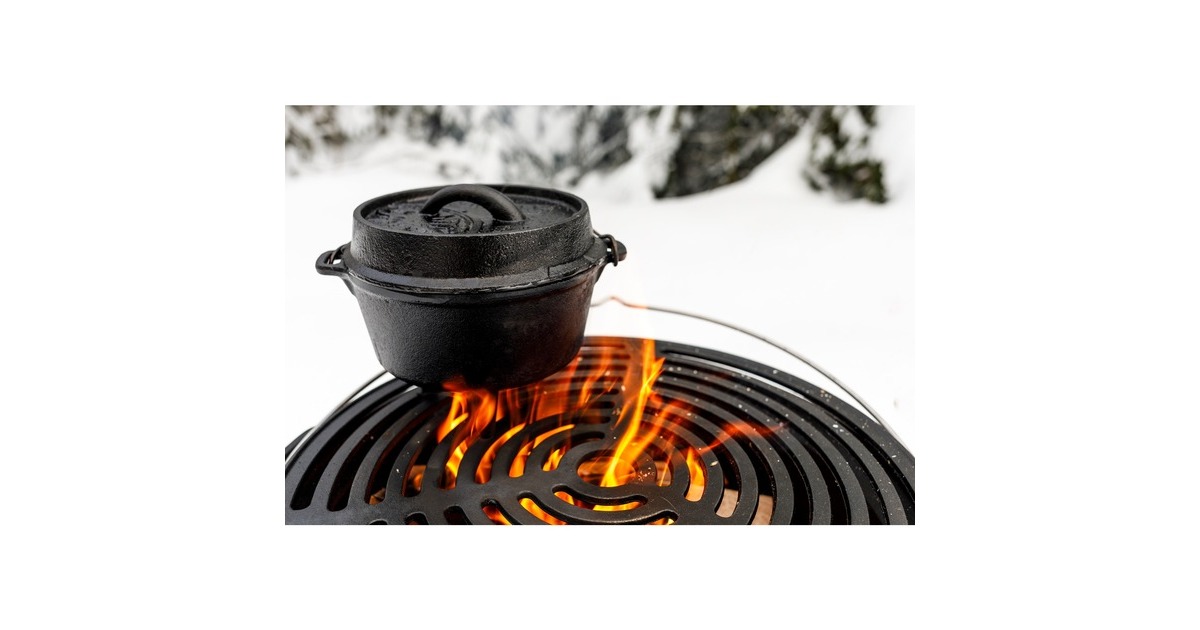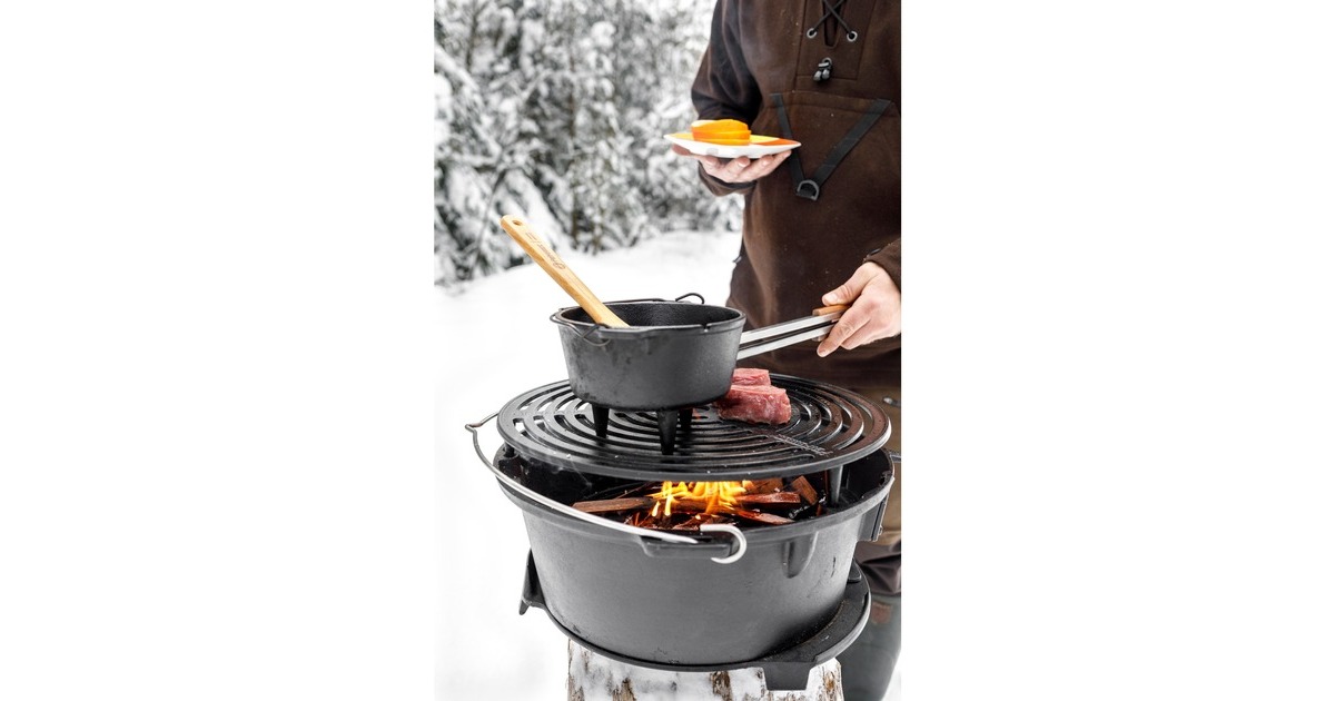 Sicheres Aufhängen am Lagerfeuer durch Einkerbung am Henkel |