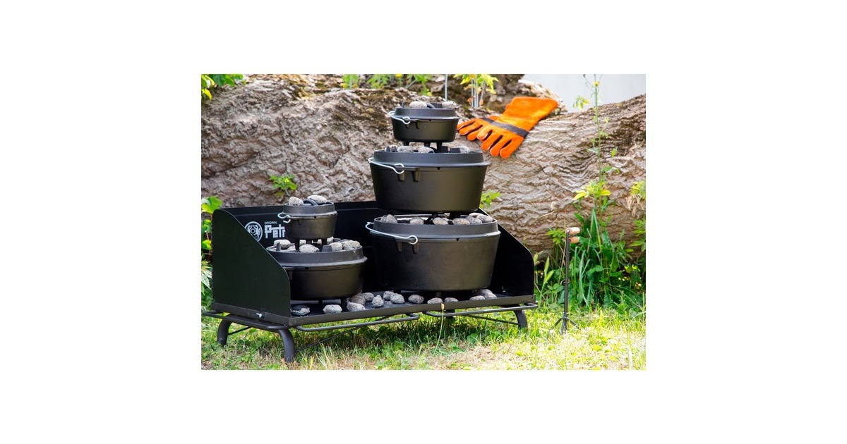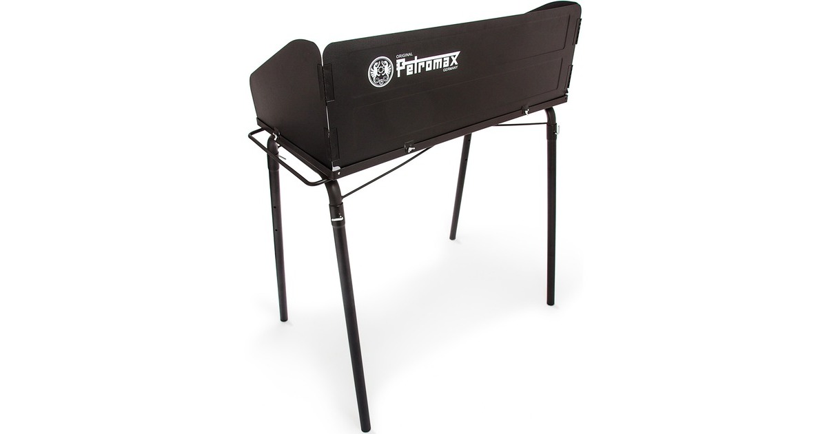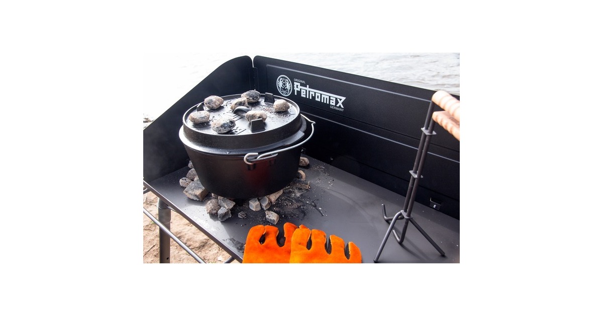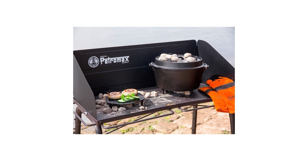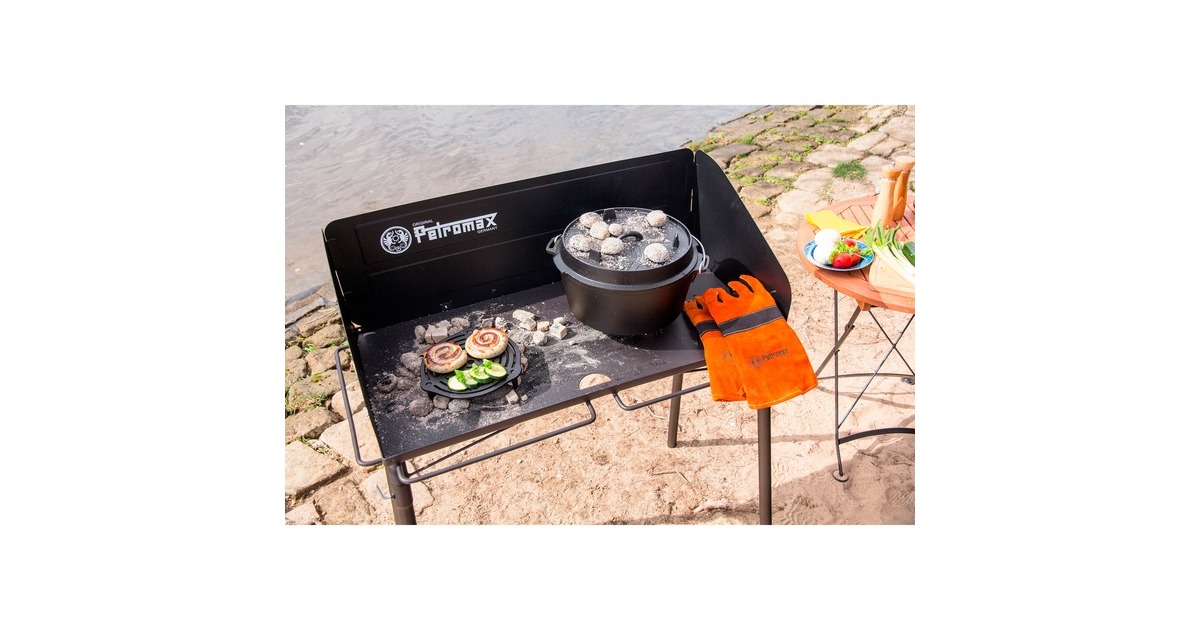 Der Petromax Feuertopf Tisch fe90 ermöglicht Draußen-Kochen im großen Stil. Er bietet eine sichere Stand- und Kochfläche für Feuertöpfe in angenehmer Arbeitshöhe von 87cm. Auf dem belastbaren Stahltisch finden je nach Größe mehrere Feuertöpfe oder Grillroste Platz. Der großzügig bemessene Windschutz ermöglicht auch im Freien energie- und kohleeffizient zu kochen. Die vier Standbeine können alternativ auch abgebaut und der Tisch auf eine beliebige, hitzeresistente Unterlage gestellt werden. Vorn und an den Seiten bieten Bügel Platz zum Aufhängen von Kohlezange, Grillhandschuhen und Co. Zum Säubern lassen sich Asche und Kohlereste einfach durch eine Aussparung im vorderen Bereich der Arbeitsfläche ausfegen.Art.-Nr.: 1533664