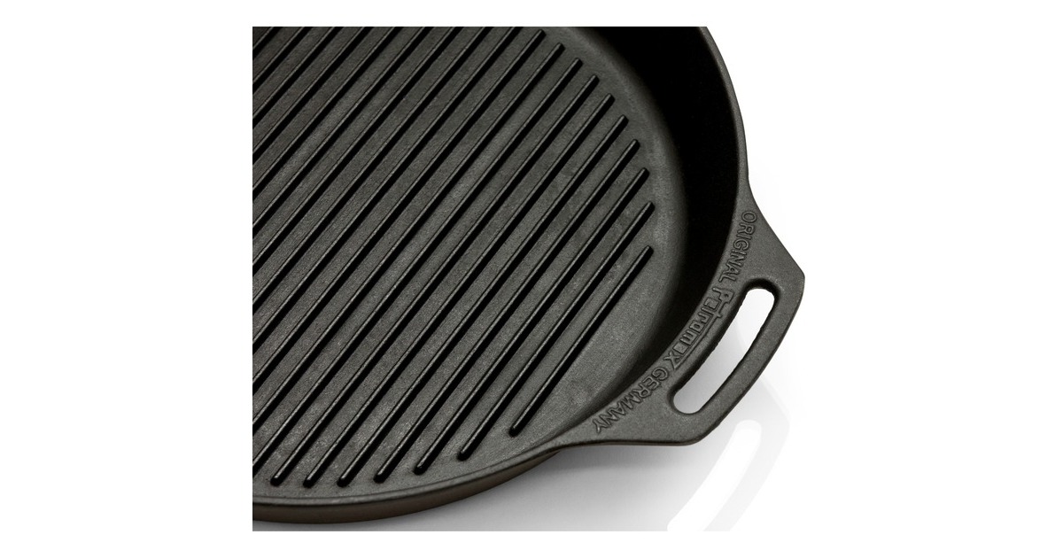 Die gusseiserne Petromax Grill-Feuerpfanne gp35 gehört mit ihrer exzellenten Wärmespeicherung zur Ausstattung jeder Küche. Sie ist für das Zubereiten von Fleisch, Gemüse und Co. mit dem besonderen Grillaroma ideal, da sich die Hitze in Gusseisen gleichmäßig verteilt und lange gespeichert wird. Die Rillen am Pfannenboden geben dem Bratgut nicht nur das typische Grillmuster, sondern ermöglichen auch besonders fettarmes und gesundes Braten. Ob in der Draußen-Küche über dem offenen Feuer gekocht wird oder auf dem Herd zuhause, man kann die Feuerpfanne sowohl auf herkömmlichen Herdplatten, auf Gasflammen, im Backofen als auch im Freien auf einer Kochstelle, über einem Lagerfeuer oder auf einem passenden Grill verwenden. Das Gusseisen mit seiner ausgezeichneten Wärmeverteilung und -speicherung ist dank der vorbehandelten Oberfläche (seasoned finish) sofort einsatzbereit und leicht zu pflegen.Art.-Nr.: 1532911