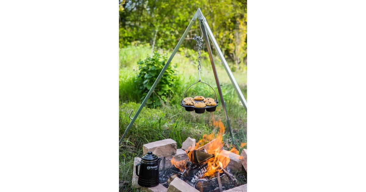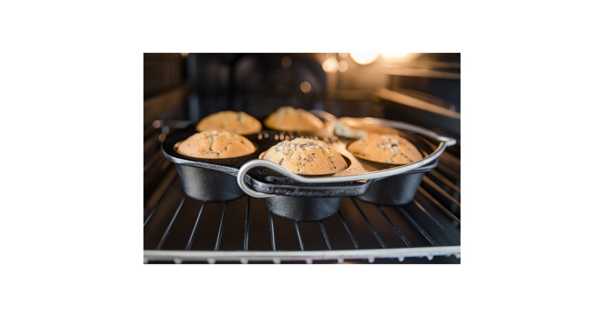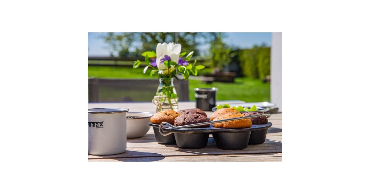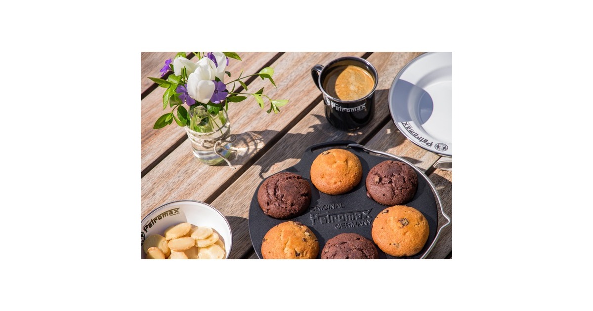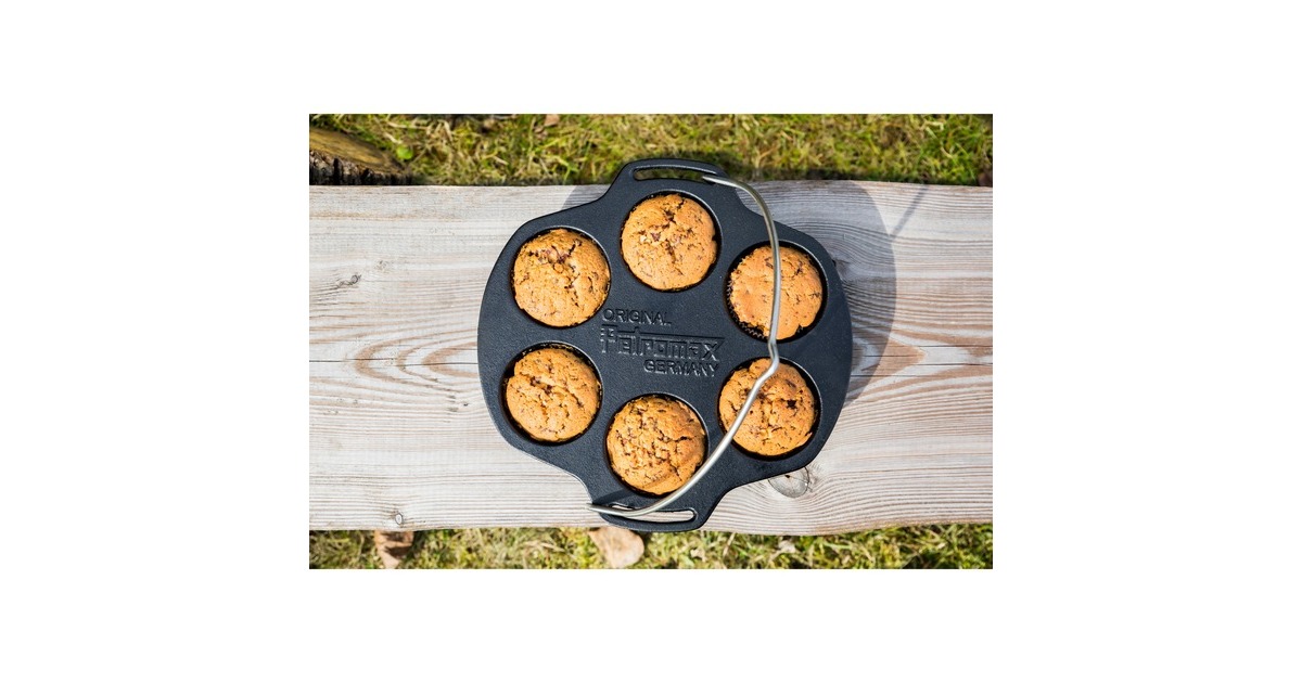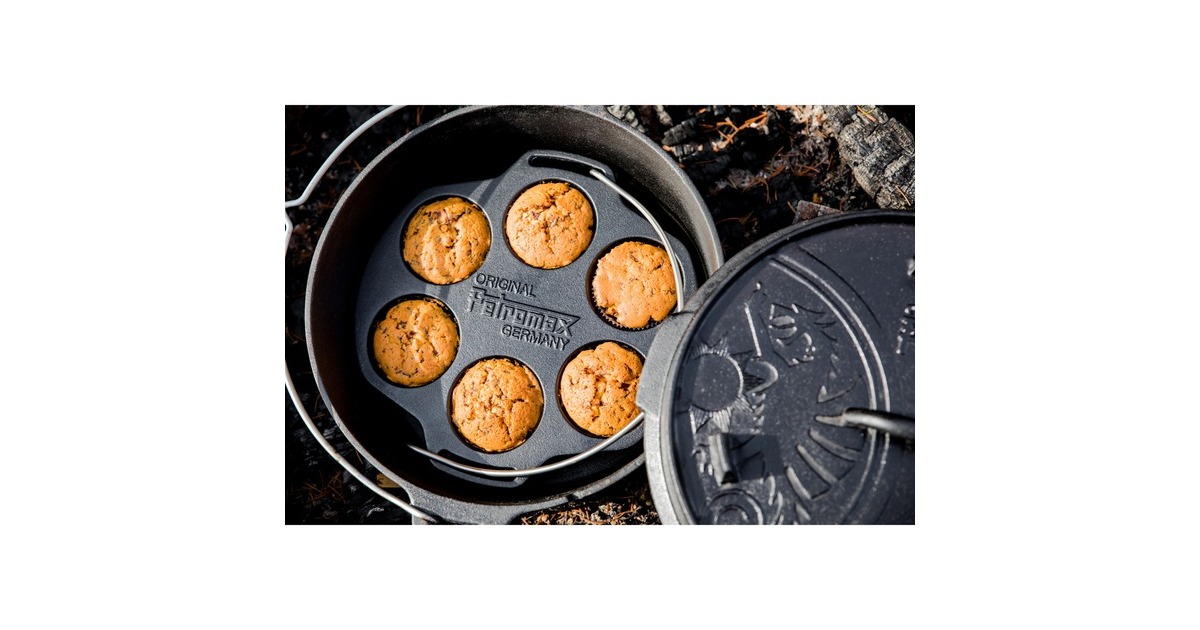 Die Petromax Muffinform mf6 ist perfekt für die Ausstattung der Draußen-Küche geeignet: Die runde Backform aus Gusseisen lädt drinnen wie draußen zum kreativen Backen ein. Sechs saftige Muffins können gleichzeitig mit dieser Form gebacken werden. Durch ihren gebogenen Edelstahl-Henkel mit Einkerbung lässt sich die Form einfach transportieren und über das Feuer hängen. Dort sowie auf Glut, Briketts oder im heimischen Backofen gelingen damit je nach Wahl sowohl herzhafte als auch süße Muffins und Pasteten. Besonders praktisch ist, dass die Muffinform auch in den Petromax Feuertopf ft6 oder ft9 eingesetzt werden kann. So kann mit Kohlen auf dem Deckel sowie unter dem Topf für ausreichend Ober- und Unterhitze gesorgt werden und die Muffins werden gleichmäßig durchgebacken. Bei diesem Muffinbackofen gilt es allerdings zu beachten, dass beim Feuertopf ft9 ein Gussrosteinsatz oder ein Untersetzer, wie der ftus, in den Topf direkt unter der Muffinform platziert werden sollte. Dies ist notwendig, damit sich das Gusseisen der Form und das vom Feuertopf an den Rändern nicht berühren können.