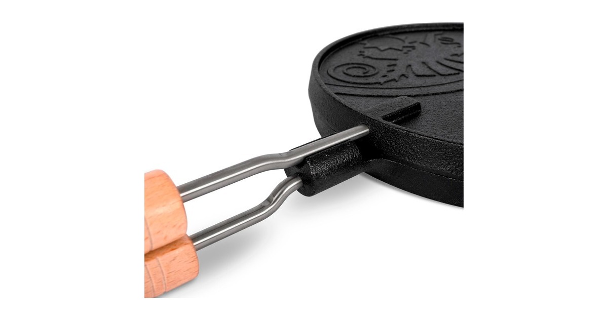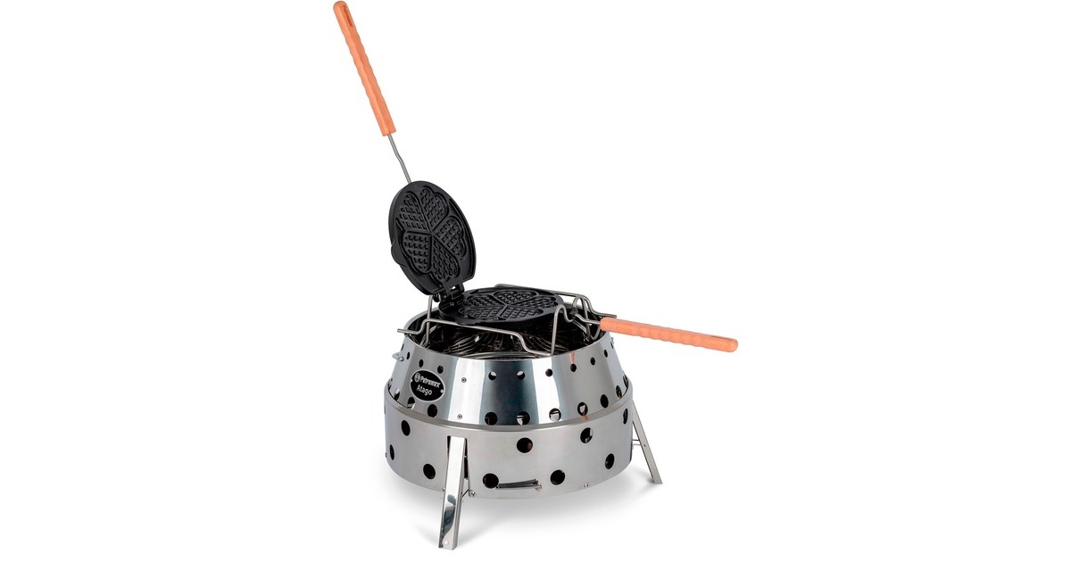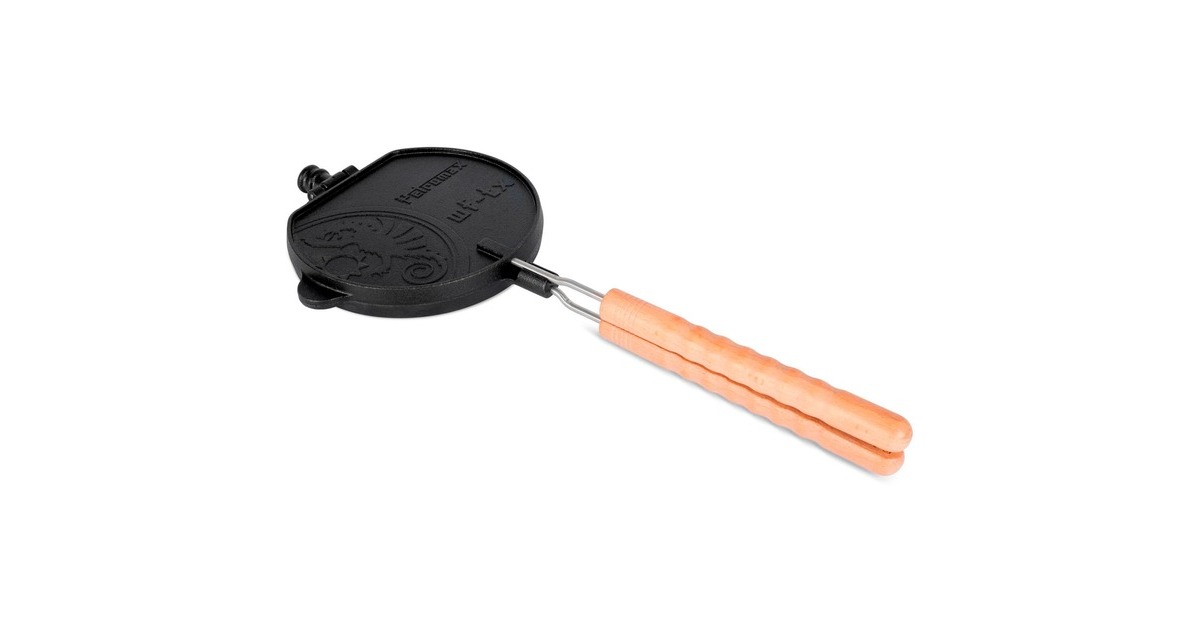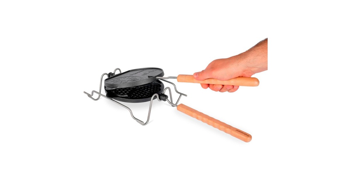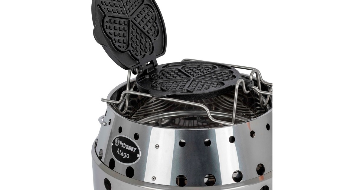 Für einen reibungslosen Wendevorgang benötigt das Waffeleisen nach unten hin Platz. Das Auflagegestell sollte daher so positioniert werden, dass es an den Seiten erhöht aufliegt und am Wendemittelpunkt ein Spielraum nach unten besteht, der mindestens der Breite des Waffeleisens entspricht. Die ideale Draußen-Kochstelle für das Wende-Waffeleisen ist der Atago (separat erhältlich): Das Auflagegestell für das Wende-Waffeleisen passt optimal auf den oberen Rand. Da das Eisen beste Ergebnisse durch indirekte Hitze erzielt, empfiehlt es sich, Kohlen als Brennmaterial zu nutzen. Durch den Abstand zwischen Kohlerost und oberen Rand des Atago besteht ausreichend Platz zum Wenden der gusseisernen Form. |