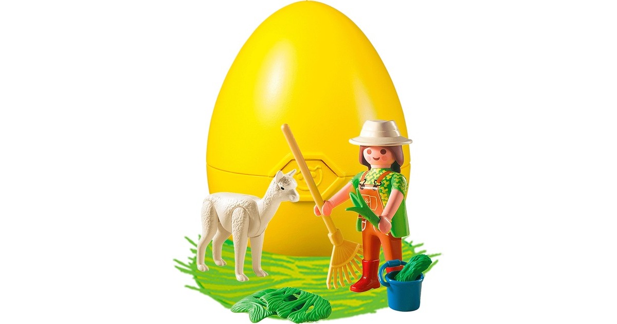 Zu seinem 50. Jubiläum im Jahr 2024 veröffentlicht PLAYMOBIL kleine Sets, die jeweils in ein buntes Osterei verpackt sind - perfekt zum Verschenken und Sammeln! Dabei kann das Osterei auch als Spardose verwendet werden. Dieses Set im gelben Ei enthält ein niedliches weißes Alpaka. Seine Pflegerin ist gerade mit der Fütterung beschäftigt - es gibt Heu, Grünfutter und als besondere Leckerei eine Yuccaspitze. Die Pflegerin trägt, Latzhose, Gummistiefel sowie einen Hut und hat einen Rechen dabei. Art.-Nr.: 100024751