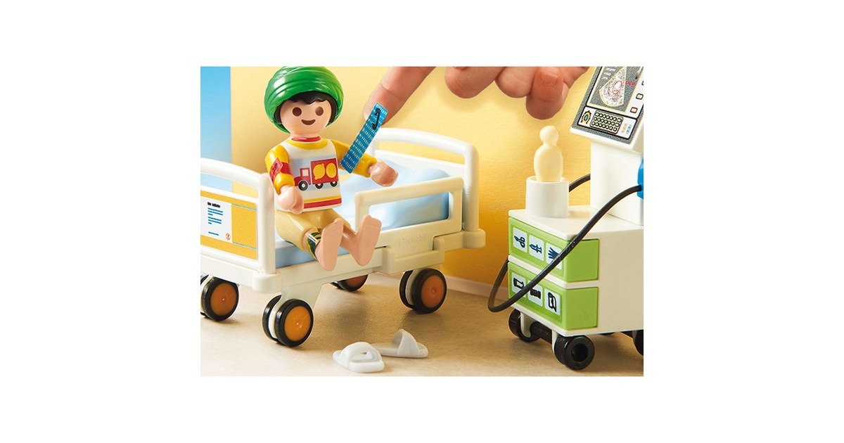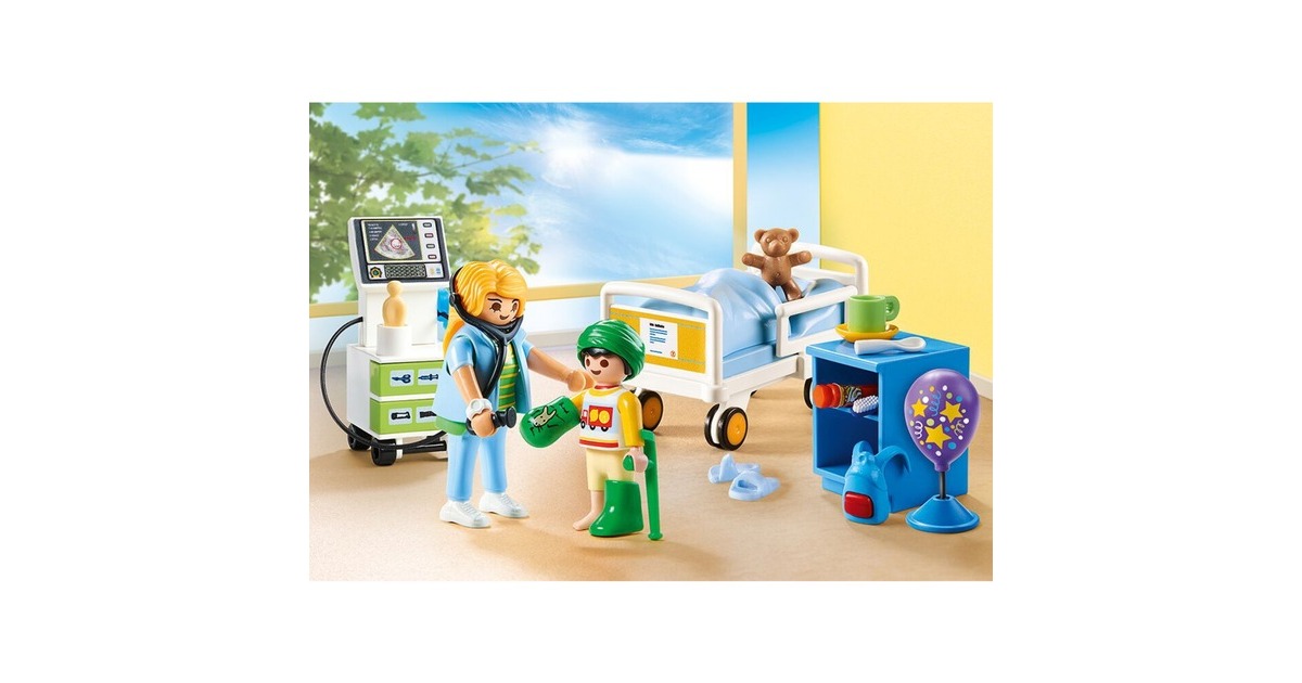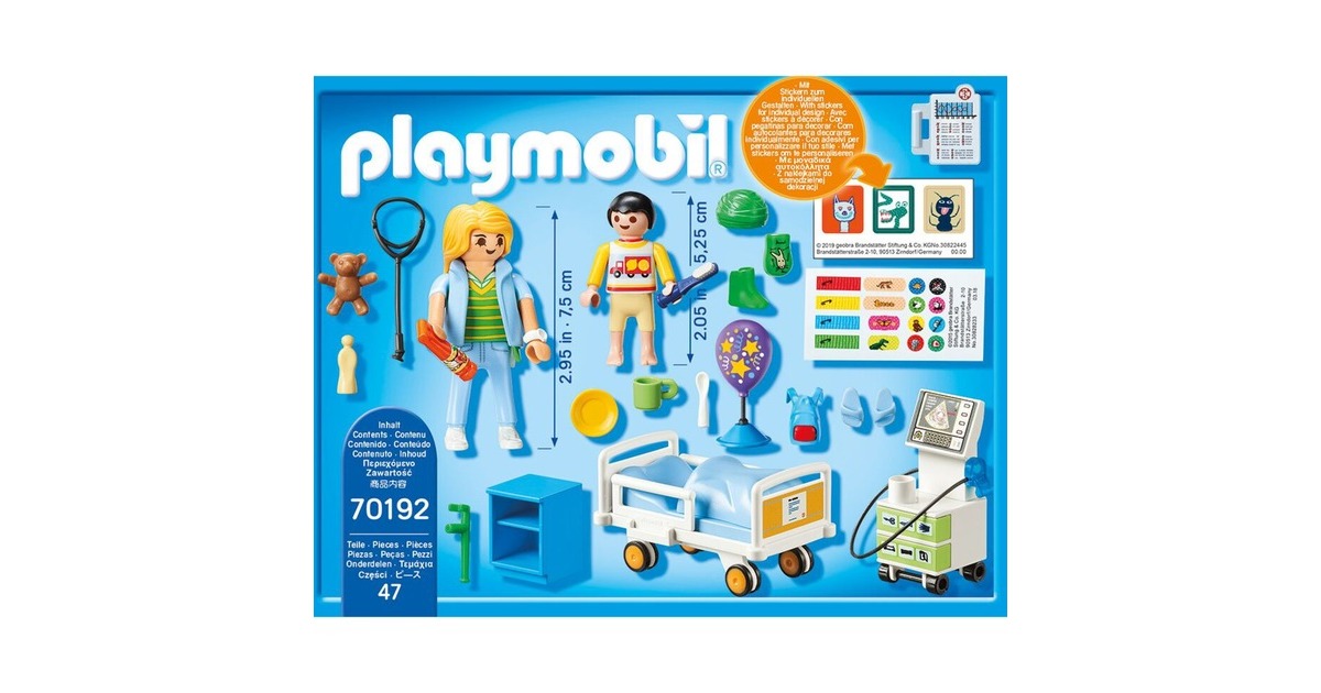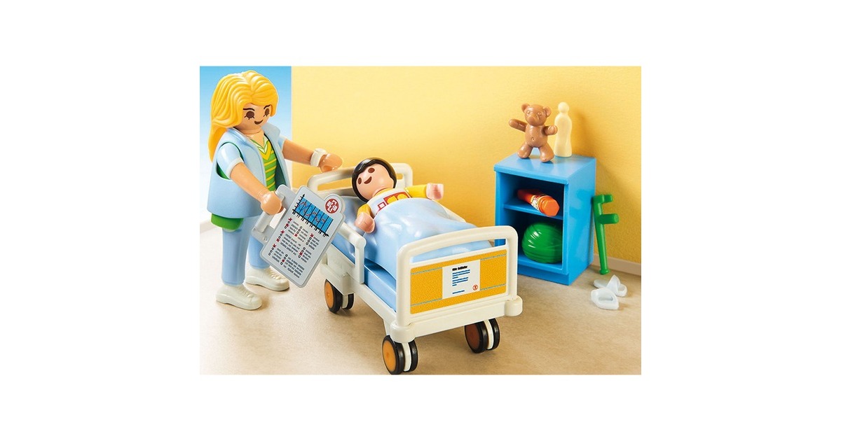1 Ärztin, 1 Kind, 1 Kinderkrankenbett, 1 Nachttisch, 1 Ultraschallwagen, 1 Stethoskop, 1 Klemmbrett, 1 Krücke, 1 Kopfverband, 1 Gipsschiene Arm, 1 Gipsschiene Fuß,1 Tube Salbe, 1 Stickerbogen mit Pflasteretiketten, 1 Stickerbogen mit Kinderbildern, 1 Rucksack, 1 Luftballonlampe, 1 Teddy, 1 Paar Patientenschuhe, 1 Flasche, 1 Löffel, 1 Teller, 1 Tasse, 1 Zahnbürste |