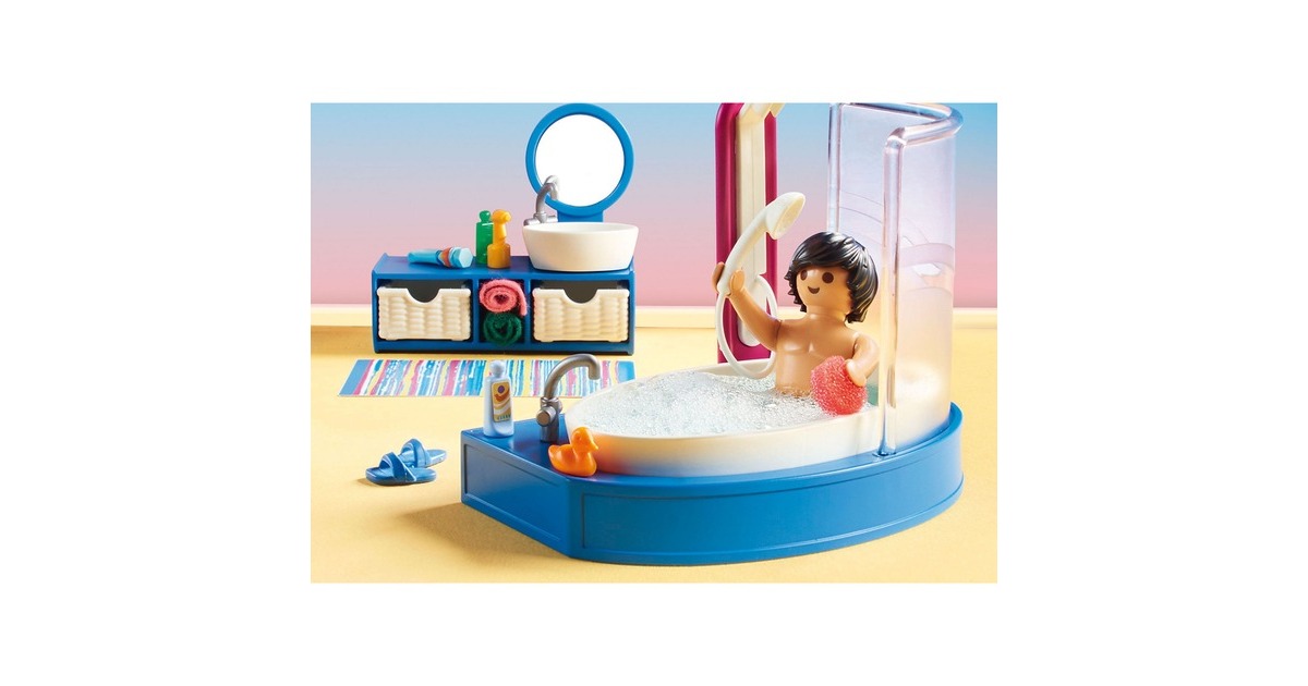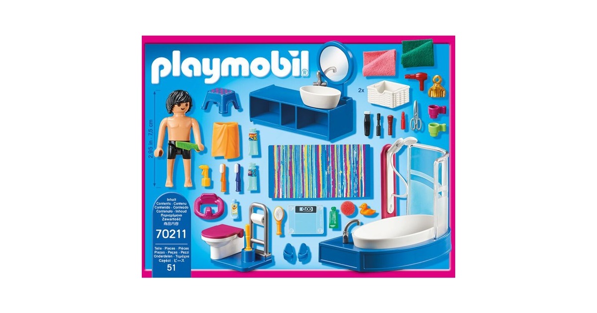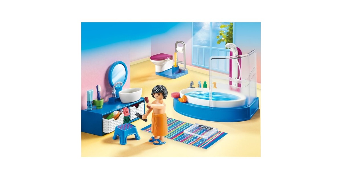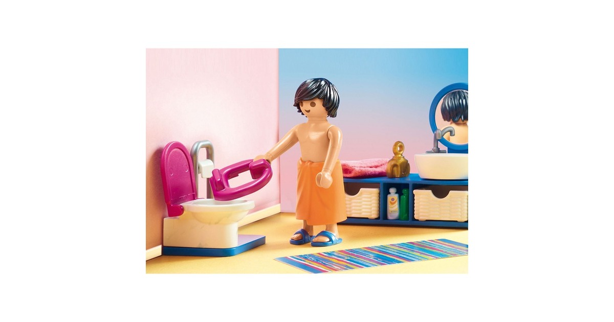 1 Mann, 1 Waschtisch mit Waschbecken und Spiegel, 1 Badewanne, 1 Toilette mit Klopapierhalter und Klobürste, 1 Kindertoilettensitz, 1 Hocker, 2 Körbe, 1 Teppich, 1 Lippenstift, 1 Wimperntusche, 1 Puderpinsel, 1 Kamm, 1 Haarbürste, 2 Tassen, 2 Tuben, 2 Zahnbürsten, 1 Sprühflasche, 1 Flakon, 1 Schere, 2 Kosmetikflaschen, 1 Haartrockner, 1 Rasierer, 1 Personenwaage, 1 Badetuch, 1 Badeente, 2 Handtücher, 1 Schwamm, 1 Paar Badeschlappen |