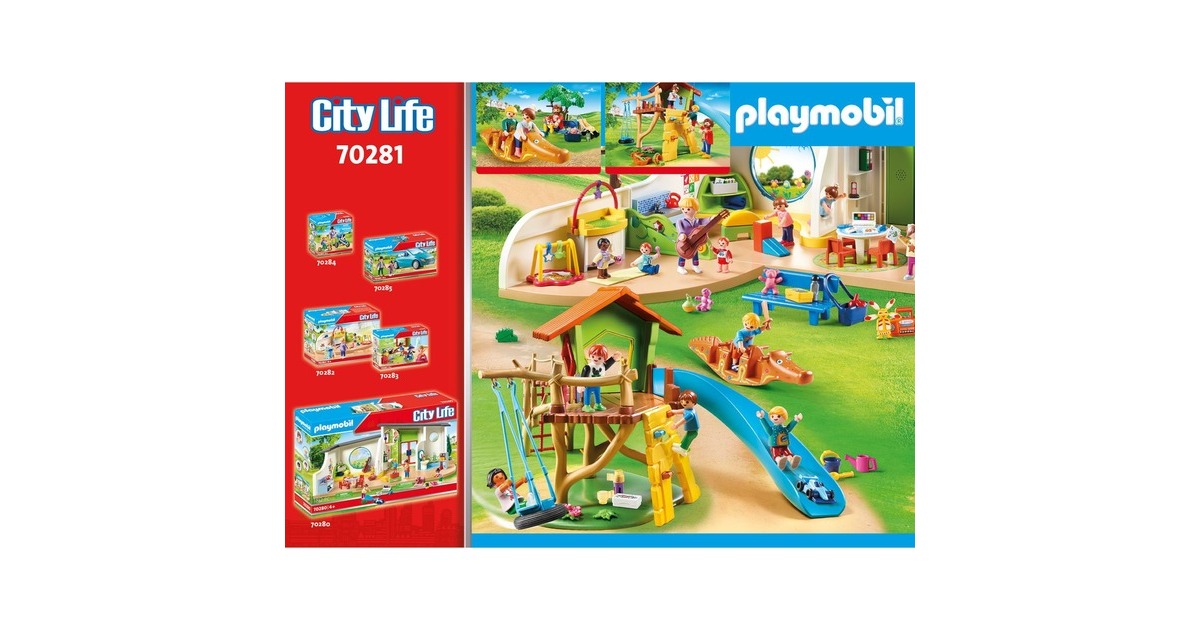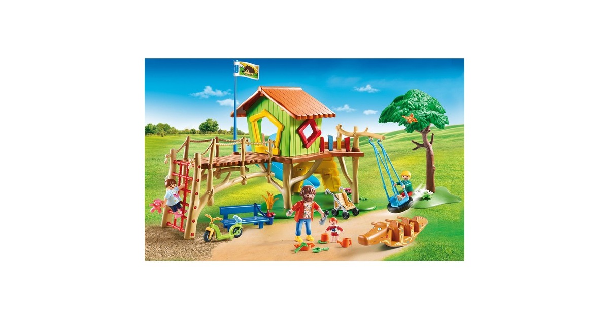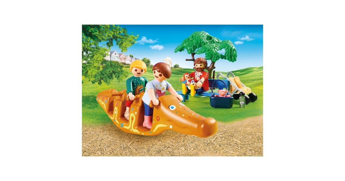 Set mit vier Playmobil-Figuren, Spielplatz mit Kletterhaus, Reifenschaukel, Kletterwand, Bank, Krokodil-Wippe, Roller, Buggy und weiteren Extras |