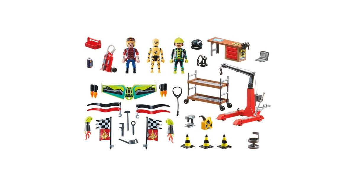 Das Set enthält eine PLAYMOBIL-Figur, ein Reparaturfahrzeug, eine Schubstange, ein Benzinfass, einen Feuerlöscher und weitere Extras. |