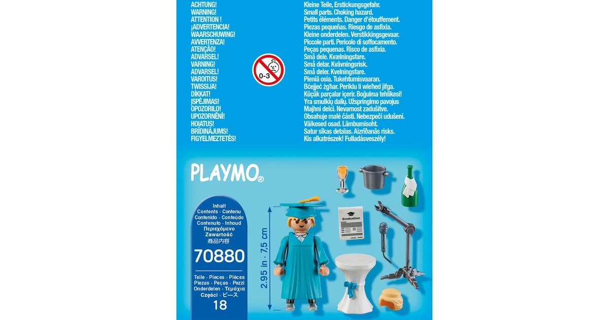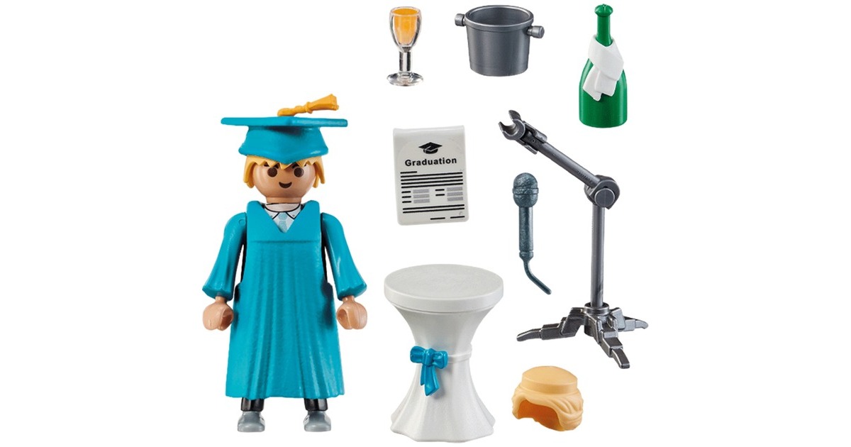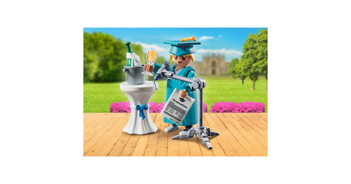Viele Jahre des Lernens liegen hinter ihm und heute ist endlich der große Tag: die Abschlussfeier. Voller Freude hält der Absolvent sein Zeugnis in den Händen. PLAYMOBIL Special Plus bietet das Plus an Spielspaß. Kleine Sets mit Figur und Accessoires ideal als Mitbringsel zum Sammeln, Tauschen oder Verschenken. Art.-Nr.: 1835486