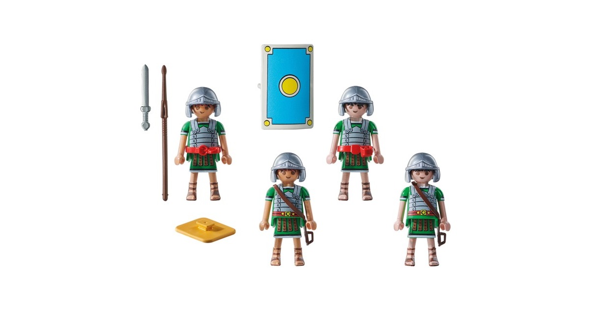 4 Römer, 4 Standplatten, 4 Schwerter, 4 Speere, 4 Schilde, 4 Helme, 4 Gürtel |