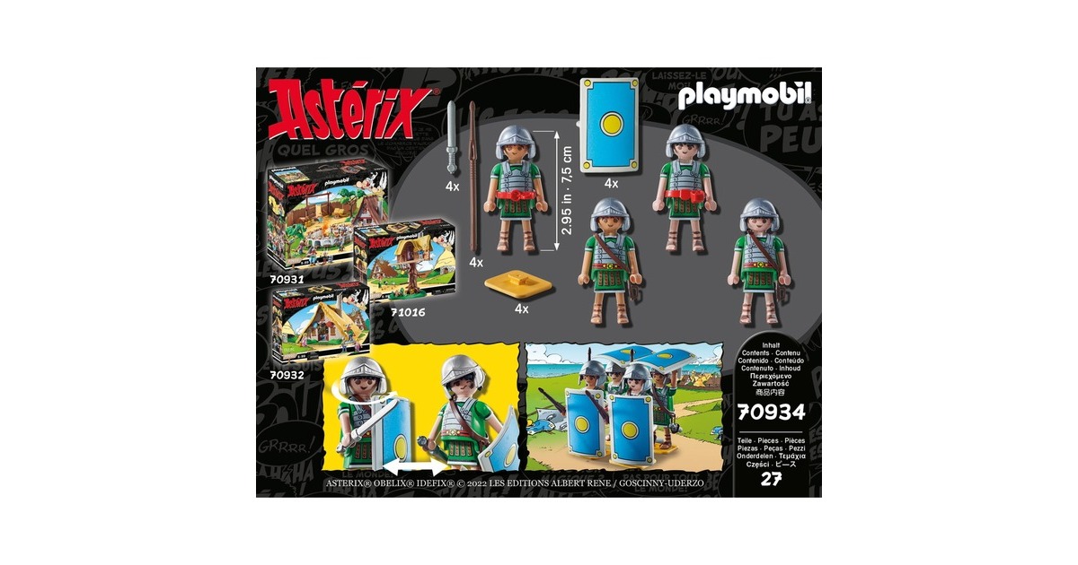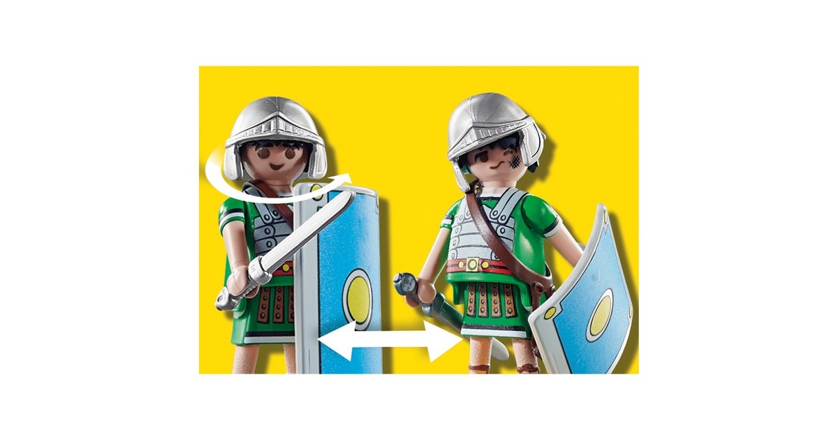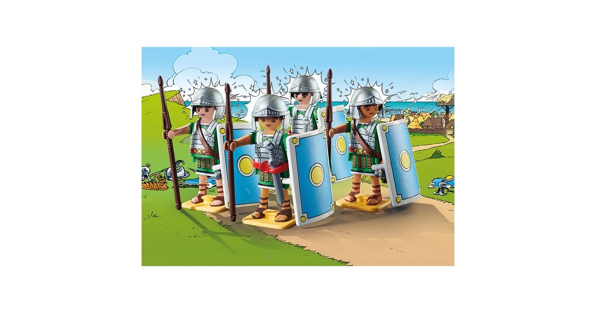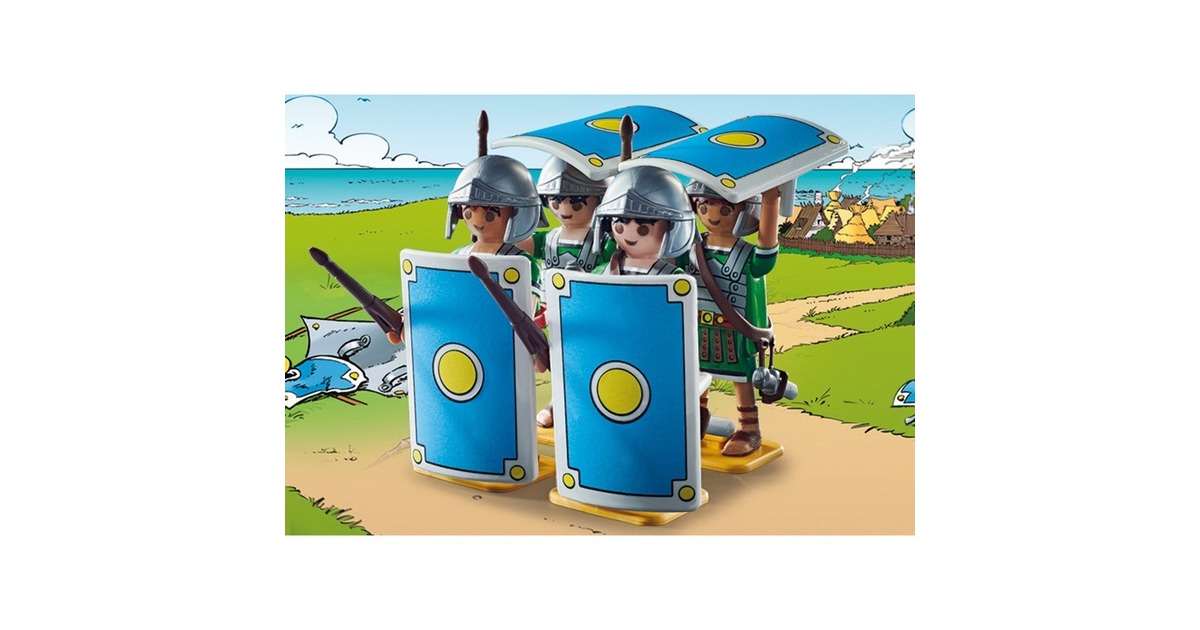 Wir schreiben das Jahr 50 v. Chr. Seit vielen Monaten versuchen die römischen Legionäre, die als Besatzung in den Lagern Babaorum, Aquarium, Laudanum und Kleinbonum stationiert sind, ein kleines Dorf voller unbeugsamer Gallier einzunehmen, das nicht aufhört, dem Eindringling Widerstand zu leisten. Um die Gallier endgültig zu schlagen, greifen die Römer mit ihrer berühmten Schildkrötenformation an. Bei dieser speziellen Angriffsformation bahnen sich die Soldaten geschützt durch Schilder vorne und oben ihren Weg. Doch auch diesmal haben Asterix, Obelix und die Dorfbewohner nicht vor, sich widerstandslos zu ergeben. Schnell ein Schlückchen Zaubertrank trinken und dann gehts ab ins Gefecht. Das Leben ist nicht leicht für die römischen Legionäre, die es mit diesen Galliern zu tun haben. Das PLAYMOBIL-Set besteht aus vier Römern mit Helmen, Schwertern und Schilden. Für einen stabileren Stand ist jeder Figur eine Standplatte beigelegt. Alle Figuren haben ein Wechselgesicht, dass die Gesichter vor und nach dem Kampf zeigt.Art.-Nr.: 1802770