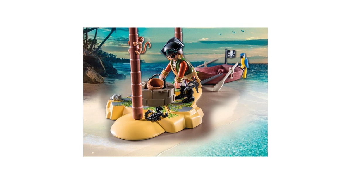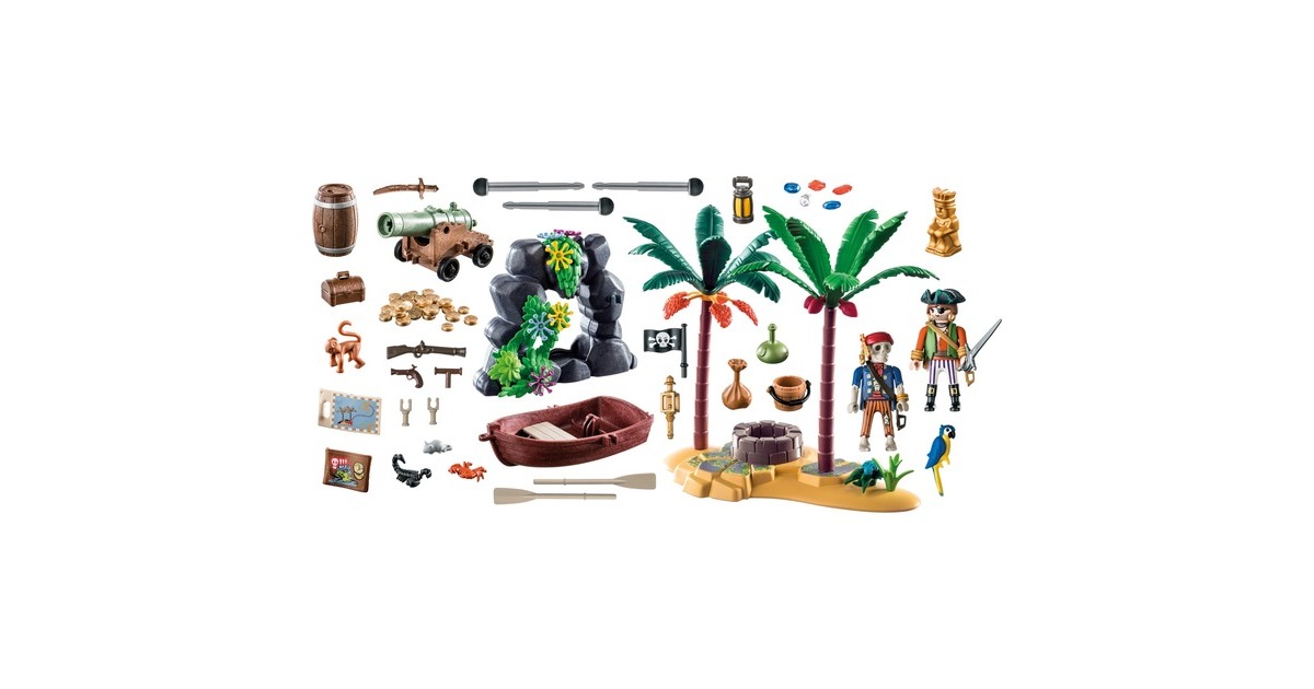Figuren: 1 Pirat, 1 Skelett. Tiere: 1 Papagei, 1 Maus, 1 Krebs, 1 Skorpion, 1 Babyaffe. Zubehör: 1 Ruderboot, 1 Totenkopf-Flagge, 1 Lampe, 1 Insel, 2 Palmen, 1 Truhe, 1 Goldmünzen, 1 Statue, 1 Fass, 1x Juwelen, 2x Gras, 5 Blüten, 1 Kanone, 1 Piratenhut, 2 Säbel, 2 Schatzkarten, 1 Pistole, 1 Gewehr. |