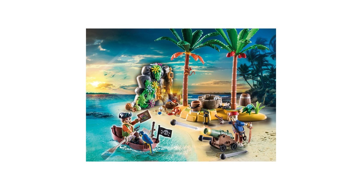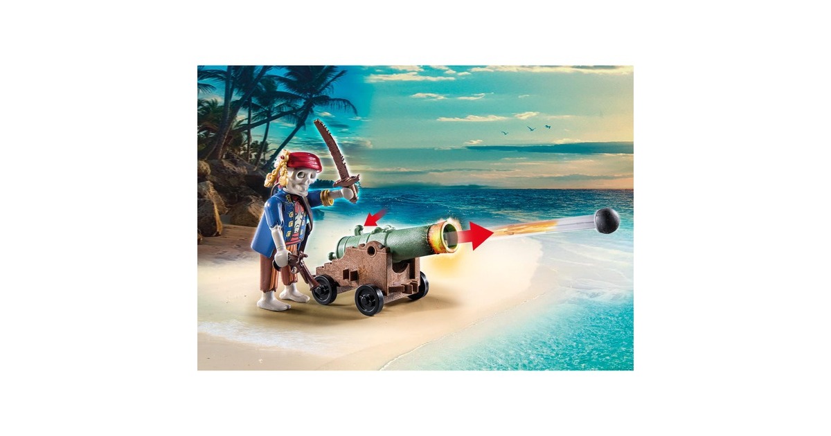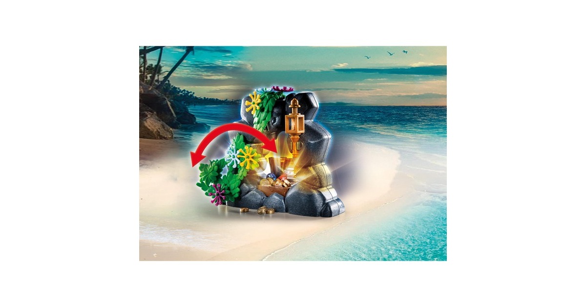 Dieses PLAYMOBIL-Set aus der Reihe Pirates bietet jede Menge abenteuerlichen Spielspaß - ganz im Stil echter Piraten. Ist die Insel geentert, muss ein Schatz gefunden und der wertvolle Fund danach verteidigt werden. Sollte sich jemand unerlaubt nähern, wird er mit Schüssen aus der Kanone begrüßt. Dabei kann die die Schatzkiste im Totenkopffelsen versteckt und mit dem drehbaren Blättervorhang verdeckt werden. Die funktionsfähige Bolzenkanone ist fahrbar und wird von vorne mit Kanonen beladen. Im Set sind drei Geschosse enthalten. Art.-Nr.: 1888886