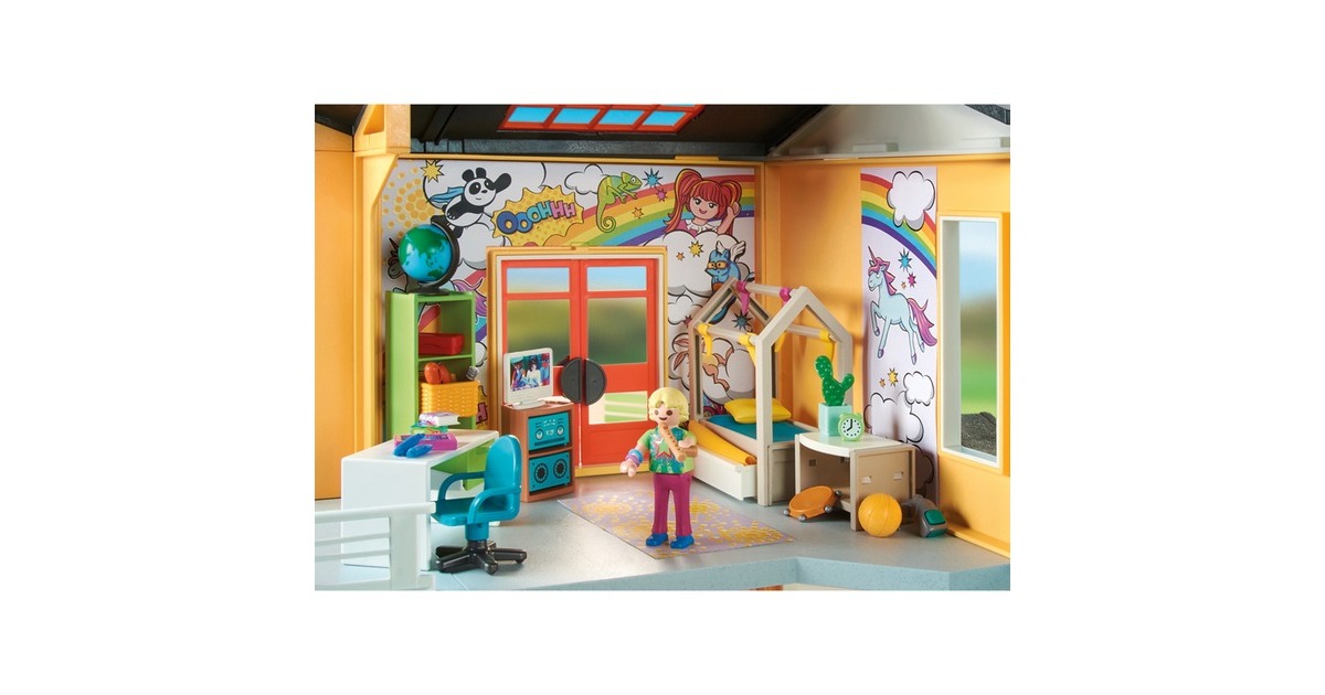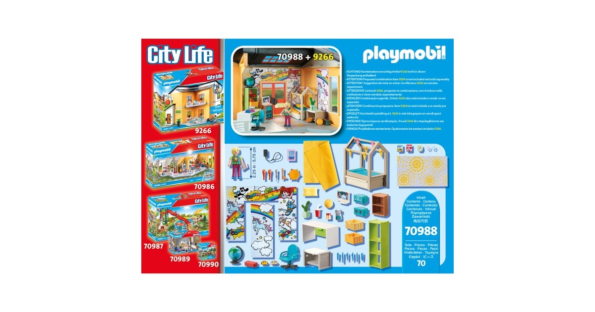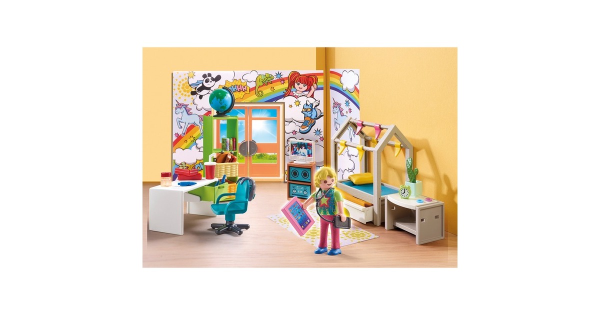 Jeder Teenager möchte unbedingt sein eigenes Zimmer haben - das gilt auch in der Welt von Playmobil City Life. Dieses fröhliche Jugendzimmer bietet alles, was das Teenagerherz begehrt. Vor allem das Bett in Hausform lädt mit seinem gemütlichen Kissen zum Kuscheln und Träumen ein. Fleißig gelesen und gelernt wird am neuen Schreibtisch. Sind die Hausaufgaben erledigt, ist Musikhören oder ein Chat mit der besten Freundin angesagt. In diesem Zimmer kann man sich nur wohlfühlen. Das Set enthält eine Mädchenfigur, einen Schreibtisch mit Stuhl, Stereoanlage, Hausbett, Globus, Flöte, Stifte, Regale und viele weitere liebevolle Extras. Mit den enthaltenen Tapetenwänden aus Karton kann die Zimmerwand verschönert werden. Über den QR-Code in der Bauanleitung stehen weitere Tapetenvorlagen zum individuellen Gestalten und ausdrucken zur Verfügung.Art.-Nr.: 1802779