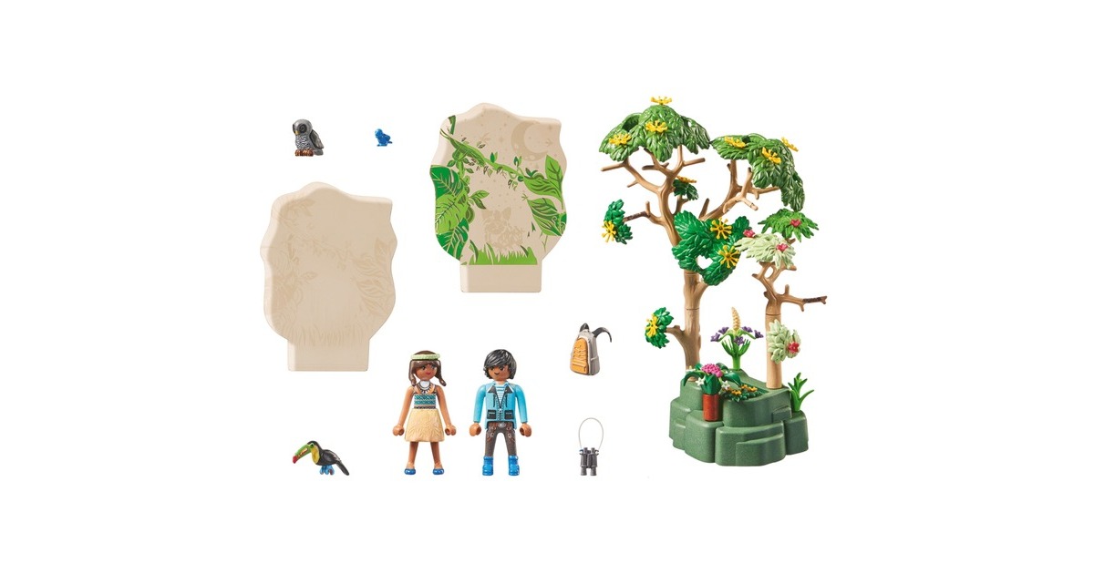 Figuren: 1 Teenager, 1 Teenagerin; Tiere: 1 Vogel, 1 Tukan, 1 Kautz; Zubehör: 1 Nachtlicht Regenwald mit vielen verschiedenen Baum- und Pflanzenelementen sowie zahlreichen Blüten, 1 Pflanzenhaarband, 1 Rucksack, 1 Fernglas, 1 Wissenskarte "Tukan" |