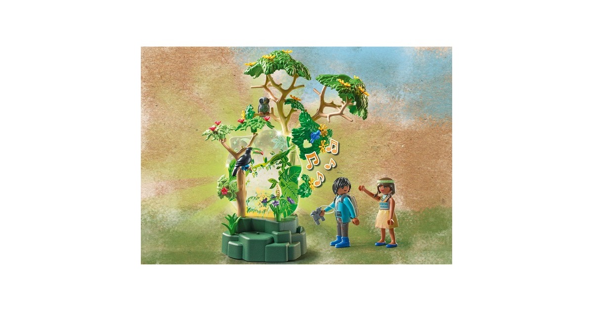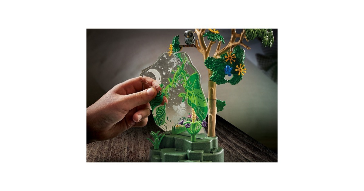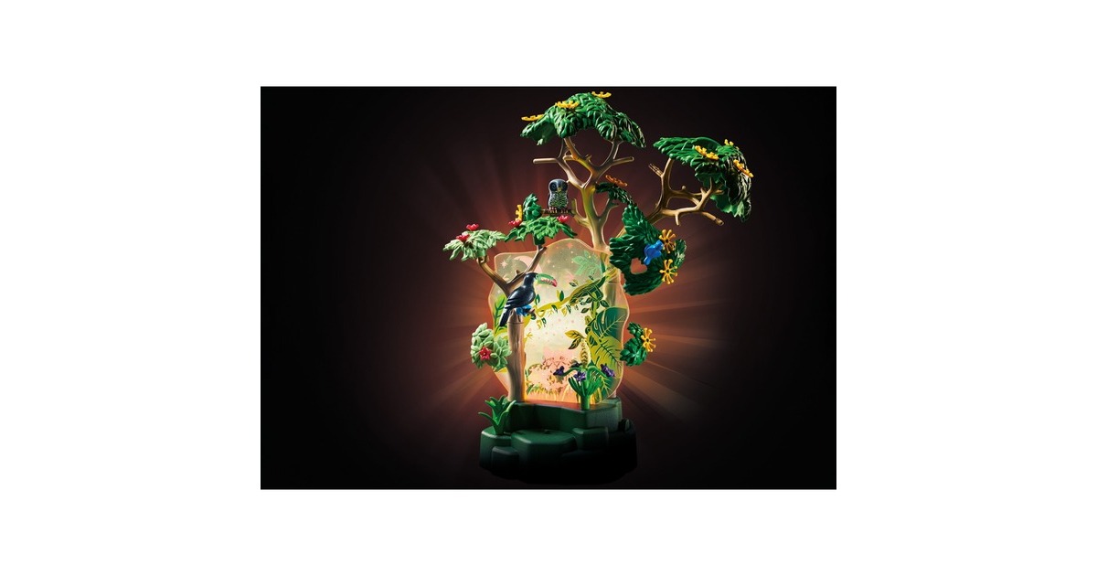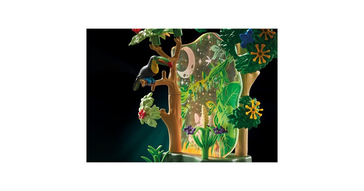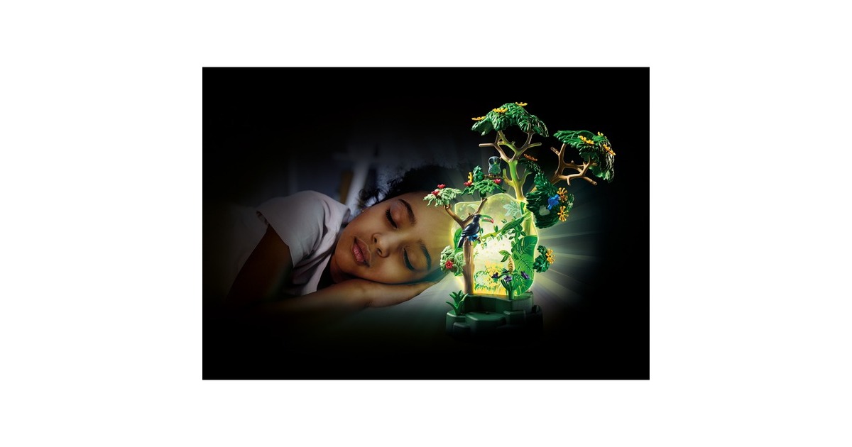 Das zauberhafte Nachtlicht bringt den Regenwald mit verschiedenen Licht- und Soundeffekten direkt ins Kinderzimmer. Im Schutz des Baumes treffen sich Alina und Rick, um zu diskutieren oder die Stille des Abends zu genießen und Rick freut sich über die hier häufig funktionierende Internetverbindung. Durch das Einsetzen verschieden gravierter Scheiben kann zwischen zwei Motiven gewechselt werden. Licht, Sound und Lautstärke können über einen Regler und einen Taster am Elektronikmodul eingestellt werden. Das Spielset enthält zwei PLAYMOBIL-Figuren Alina da Silva und Rick Palmer, ein Nachtlicht mit Regenwaldgeräuschen, zwei Motivscheiben zum Wechseln, einen Tukan, einen Waldkauz, eine Tierwissenskarte Tukan sowie weitere spannende Extras. Art.-Nr.: 1840615