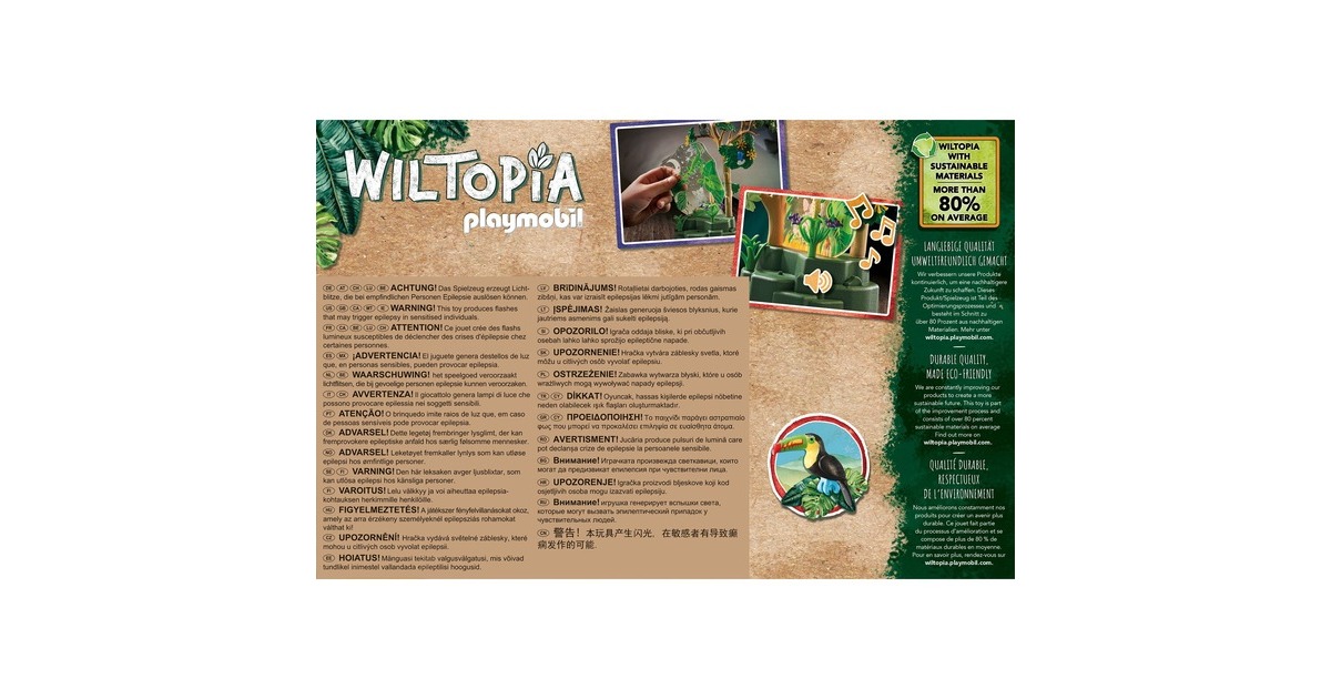 Wiltopia - Wundervoll für die Umwelt Wiltopia ist die erste PLAYMOBIL-Produktreihe, die im Schnitt aus über 80 % nachhaltigem Material besteht. Aussortierte Kunststoff-Abfälle erhalten ein neues Leben und dienen als Materialquelle für diese außergewöhnliche Spielwelt. Das schont Ressourcen und vor allem die Umwelt. Natürlich entsprechen alle Wiltopia-Produkte den gewohnt hohen Sicherheitsstandards und der bewährten PLAYMOBIL-Qualität und Langlebigkeit. |