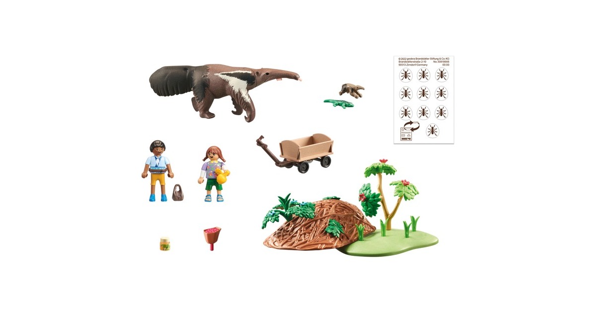 Figuren: 1 Junge, 1 Mädchen; Tiere: 1 Ameisenbär, 1 junger Ameisenbär, 1 Eidechse; Zubehör: 1 Ameisenbau mit Pflanzen, 1 Bollerwagen, 1 Tierfutter, 1 Marmeladenglas, 1 Gürteltasche, 1 Stickerbogen 'Ameisen', 1 Wissenskarte 'Ameisenbär' |