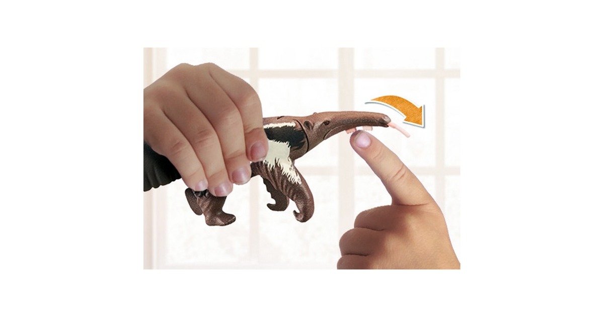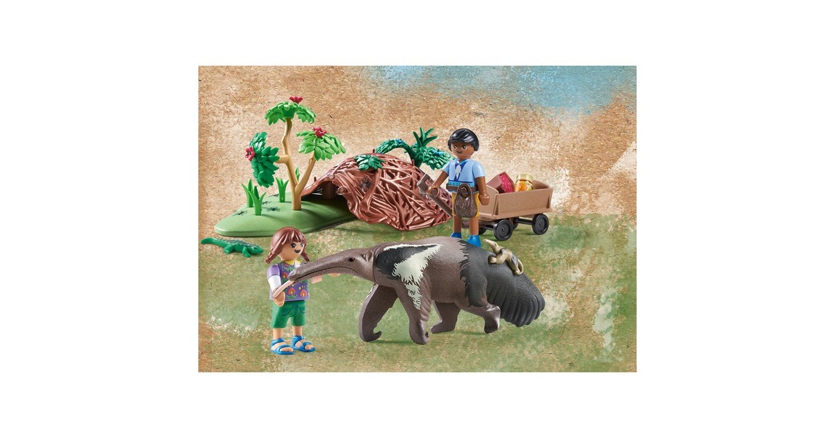 Zu Beginn ihrer Forschungsreise finden die Palmers ein Ameisenbärbaby, das sich nach seiner Mutter sehnt. Lu nimmt es auf sich, die Ameisenbärenmutter zu finden, eine scheinbar unmögliche Aufgabe. Am Ende ihres Aufenthalts im Amazonas findet Lu nach einer fast aussichtslosen Suche die Ameisenbärenmutter auf einem Ameisenhügel und bringt das Baby zu seiner Mutter zurück, die es freudig annimmt. Auch wenn Lu das Ameisenbärbaby gerne als lebenslangen Freund behalten hätte, spürt sie, dass das Ameisenbärbaby in die Natur und zu seiner Mutter gehört. Die lange Zunge der neu gestalteten Ameisenbär-Figur ist beweglich und kann herausgeschoben werden, damit sie die Aufkleber-Ameisen "fressen" kann. Das Set enthält zwei PLAYMOBIL-Kinderfiguren, einen Ameisenbär mit Baby, einen Ameisenhaufen mit Pflanzen, einen Bollerwagen, eine Tierwissenskarte und viele weitere Extras. Mit neuer Figurengröße für Kinder von 5,75 cm. Art.-Nr.: 1840624