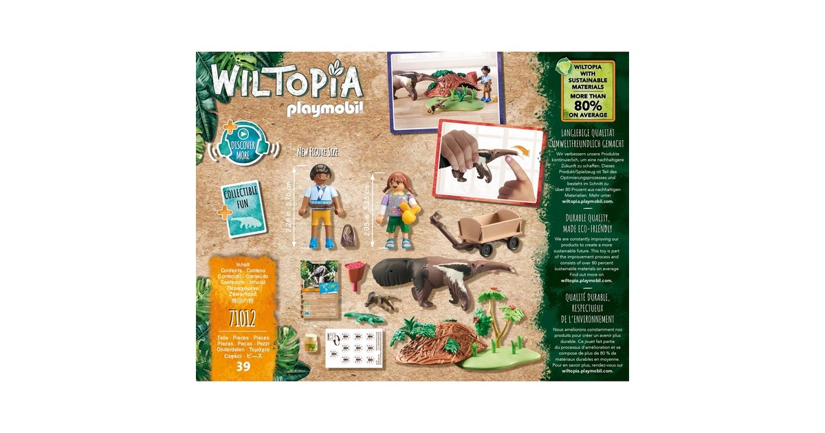 Wiltopia - Wundervoll für die Umwelt Wiltopia ist die erste PLAYMOBIL-Produktreihe, die im Schnitt aus über 80 % nachhaltigem Material besteht. Aussortierte Kunststoff-Abfälle erhalten ein neues Leben und dienen als Materialquelle für diese außergewöhnliche Spielwelt. Das schont Ressourcen und vor allem die Umwelt. Natürlich entsprechen alle Wiltopia-Produkte den gewohnt hohen Sicherheitsstandards und der bewährten PLAYMOBIL-Qualität und Langlebigkeit. |