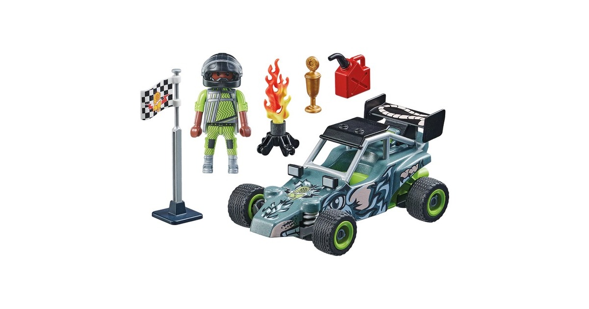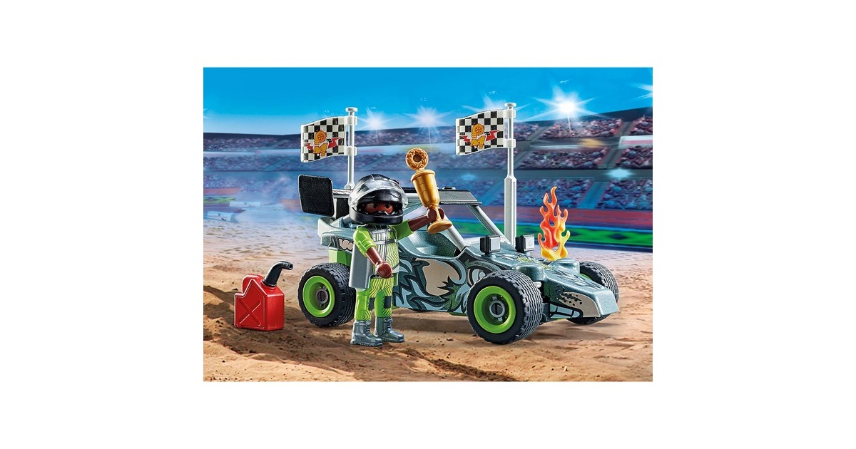 Figuren: 1 Offroad-Racer. Zubehör: 1 Stuntcar, 1 Helm, 1 Benzinkanister, 1 Pokal, 2 Siegerfahnen, 3 Feuer |