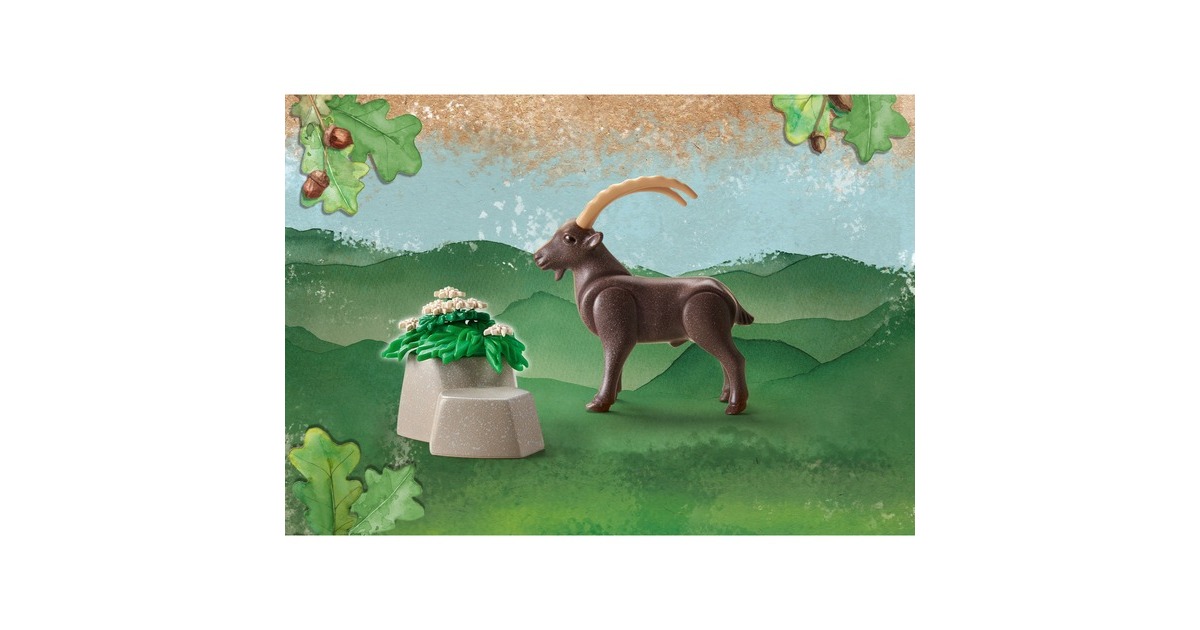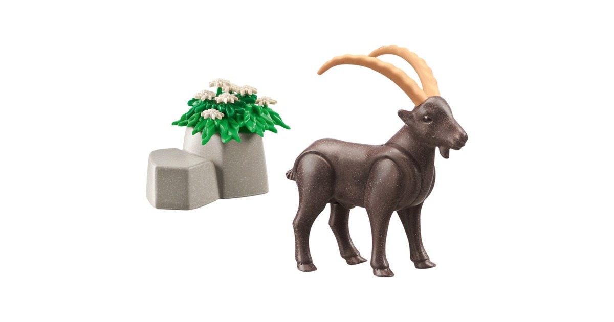 PLAYMOBIL Steinbock inklusive Zubehör, Tierwissenskarte zum Sammeln und spannendem Audio-Content. Die Wiltopia-Reihe von PLAYMOBIL lässt Kinder Tiere und Natur in ihrem eigenen Kosmos entdecken und in fantasievolle Rollenspiele eintauchen. Steinböcke sind wahre Klettermeister und werden auch als 'Könige der Alpen' bezeichnet. Nur wenige große Säugetiere fühlen sich in den Bergen, in mehreren Tausend Metern Höhe, so wohl wie die Steinböcke. Dank ihrer hervorragenden Kletterkünste, können Steinböcke auch schwer zugängliche Futterstellen mühelos erreichen. Die Hörner der Steinböcke wachsen bis zu ihrem Lebensende – jährlich um zwei bis sechs Zentimeter. Je länger das Gehörn eines Steinbocks ist, desto älter ist das Tier also! Bei männlichen Tieren – den Böcken – werden die Hörner bis zu 1 Meter lang und können alleine schon 10 kg oder mehr wiegen. Das ist das Gewicht eines großen gefüllten Wassereimers. Im PLAYMOBIL-Set enthalten ist ein Steinbock, ein Fels mit Edelweiß und eine Tierwissenskarte. Die Tierfigur kann ihren Kopf nach oben und unten neigen und alle vier Beine einzeln bewegen.