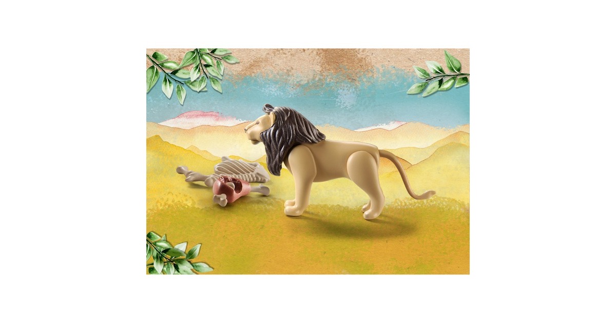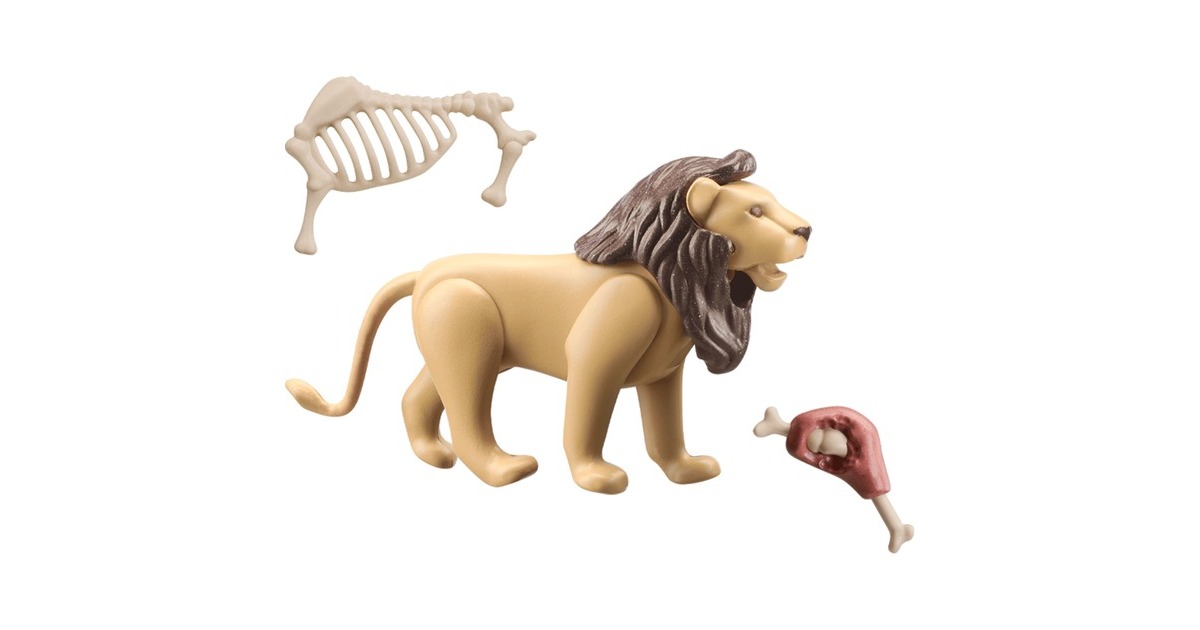 Das PLAYMOBIL-Set enthält einen Löwen, ein Gerippe, Fleisch und eine Tierwissenskarte. Der Figur kann ihren Kopf nach oben und unten neigen, den Unterkiefer aufklappen, alle vier Beine einzeln bewegen und den Schwanz drehen.