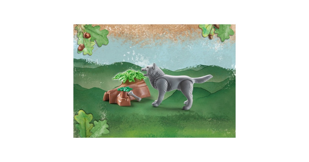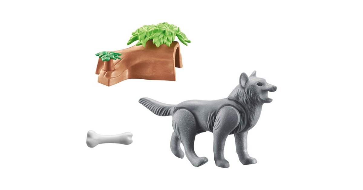 Bewegliche Wolf-Figur, einen Baumstamm mit Grün, einen Knochen und eine Tierwissenskarte. |