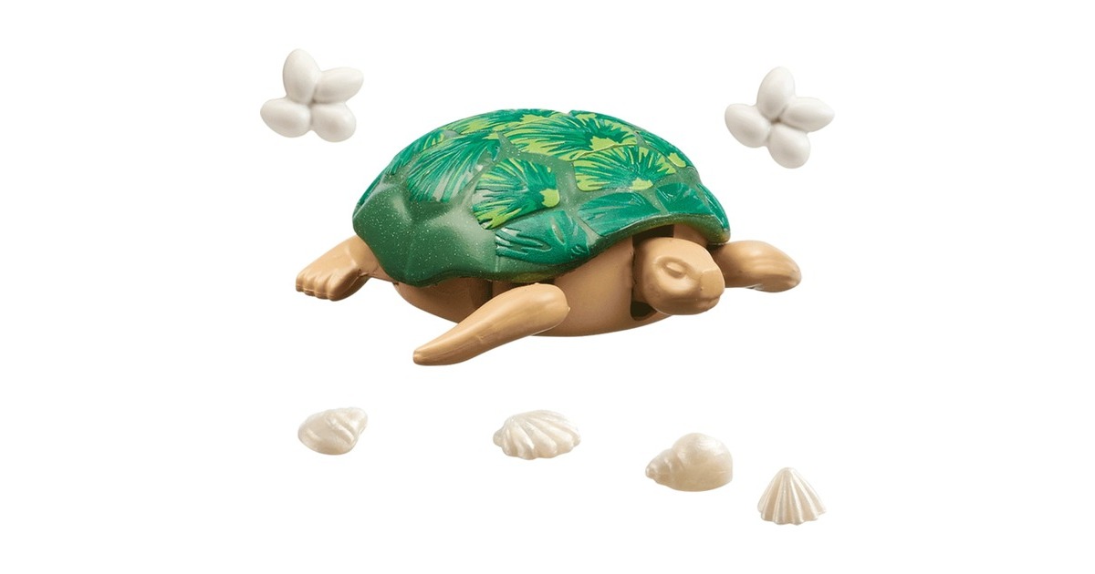 PLAYMOBIL Riesenschildkröte inklusive Zubehör, Tierwissenskarte zum Sammeln und spannendem Audio-Content. Die Wiltopia-Reihe von PLAYMOBIL lässt Kinder Tiere und Natur in ihrem eigenen Kosmos entdecken und in fantasievolle Rollenspiele eintauchen. Schildkröten sind beeindruckende Lebewesen. Sie können zwischen 150 bis 200 Jahre alt werden. Das Lebensmotto der Schildkröten heißt: Nur die Ruhe! Sie lassen sich für alles Zeit, wie zum Beispiel für das Wachsen. Schildkröten wachsen ein Leben lang. Während sie allerdings die ersten 40 Lebensjahre schneller wachsen, sind es in den späteren Jahren nur noch wenige Millimeter oder Zentimeter im Jahr. Zudem sind sie sehr genügsame Zeitgenossen. In der Regel schlafen sie bis zu 16 Stunden am Tag und können sogar monatelang ohne Futter und Wasser auskommen. Die Wiltopia-Spielwelt von PLAYMOBIL lädt Kinder dazu ein, spannende und schützenswerte Regionen unserer Welt und ihre zahlreichen tierischen Bewohner zu entdecken und verbindet Spielen und Lernen auf einzigartige Weise. Das PLAYMOBIL-Spielset enthält eine Riesenschildkröte, zwei Eier, vier Muscheln und eine Tierwissenskarte. Die Riesenschildkröte kann ihren Kopf leicht nach oben und unten neigen und ihre vier Beine einzeln etwas nach vorne und hinten bewegen.