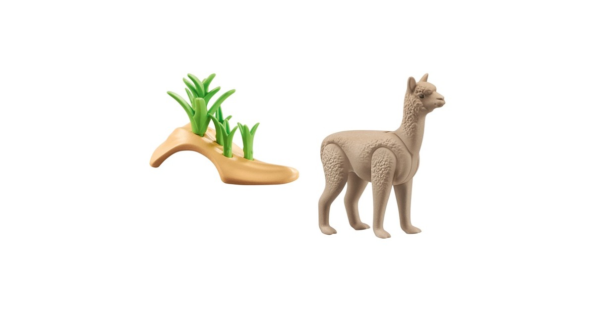 PLAYMOBIL Alpaka inklusive Zubehör, Tierwissenskarte zum Sammeln und spannendem Audio-Content. Die Wiltopia-Reihe von PLAYMOBIL lässt Kinder Tiere und Natur in ihrem eigenen Kosmos entdecken und in fantasievolle Rollenspiele eintauchen. Alpakas, so wie Lamas, gehören zur Familie der Kamele. Um sich vor Wind und Wetter in den Bergen zu schützen, haben Alpakas ein sehr dichtes, flauschiges Fell. Da Alpaka-Wolle leichter, weicher und wärmer ist als Schafswolle, ist sie sehr beliebt. Einmal im Jahr werden Alpakas geschoren, dabei können bis zu 6 kg Wolle anfallen - das reicht für bis zu 10 dicke, warme, kuschelig-weiche Pullover. Die Wiltopia-Spielwelt von PLAYMOBIL lädt Kinder dazu ein, spannende und schützenswerte Regionen unserer Welt und ihre zahlreichen tierischen Bewohner zu entdecken und verbindet Spielen und Lernen auf einzigartige Weise. Das PLAYMOBIL-Spielset enthält ein Alpaka, eine Graspflanze und eine Tierwissenskarte. Das Alpaka kann seinen Kopf nach oben und unten neigen und alle vier Beine einzeln bewegen.