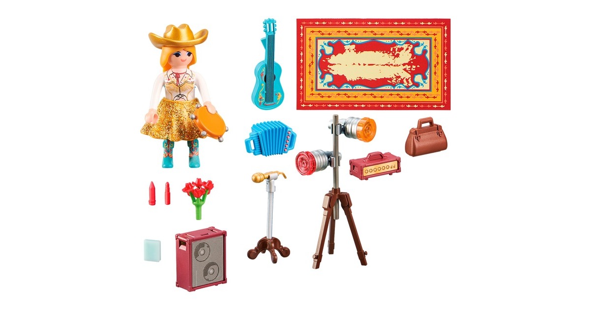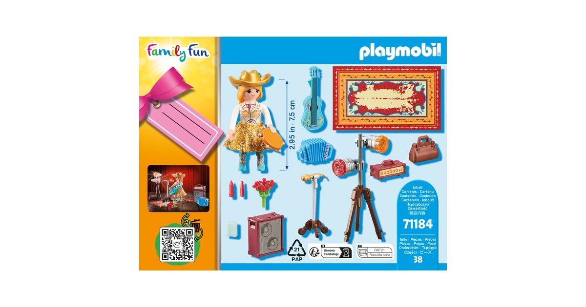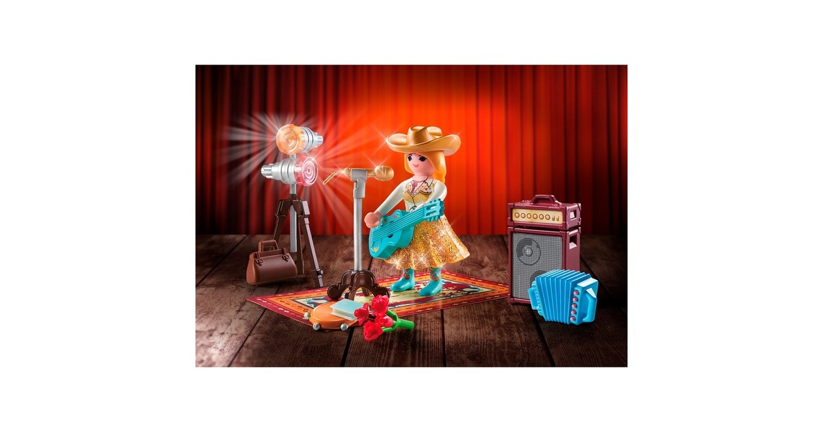 Figuren: 1 Countrysängerin; Zubehör: 1 Tamburin, 1 Gitarre, 1 Akordeon, 1 Teppich, 1, Scheinwerfer, 1 Tasche, 1 Verstärker, 1 Lautsprecher, 1 Mikrofon m. Ständer, 1 Blumenstrauß, 1 Stift, 1 Lippenstift, 1 Buch |