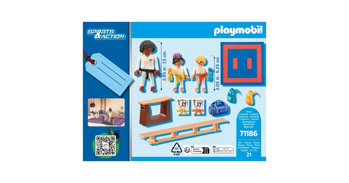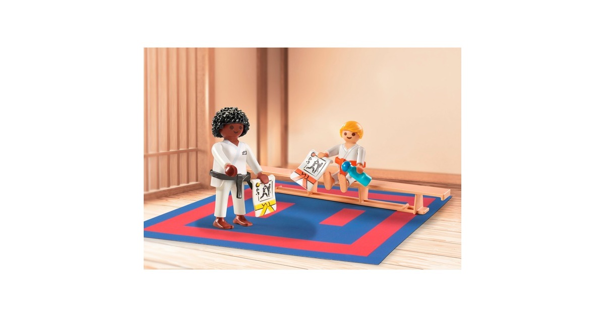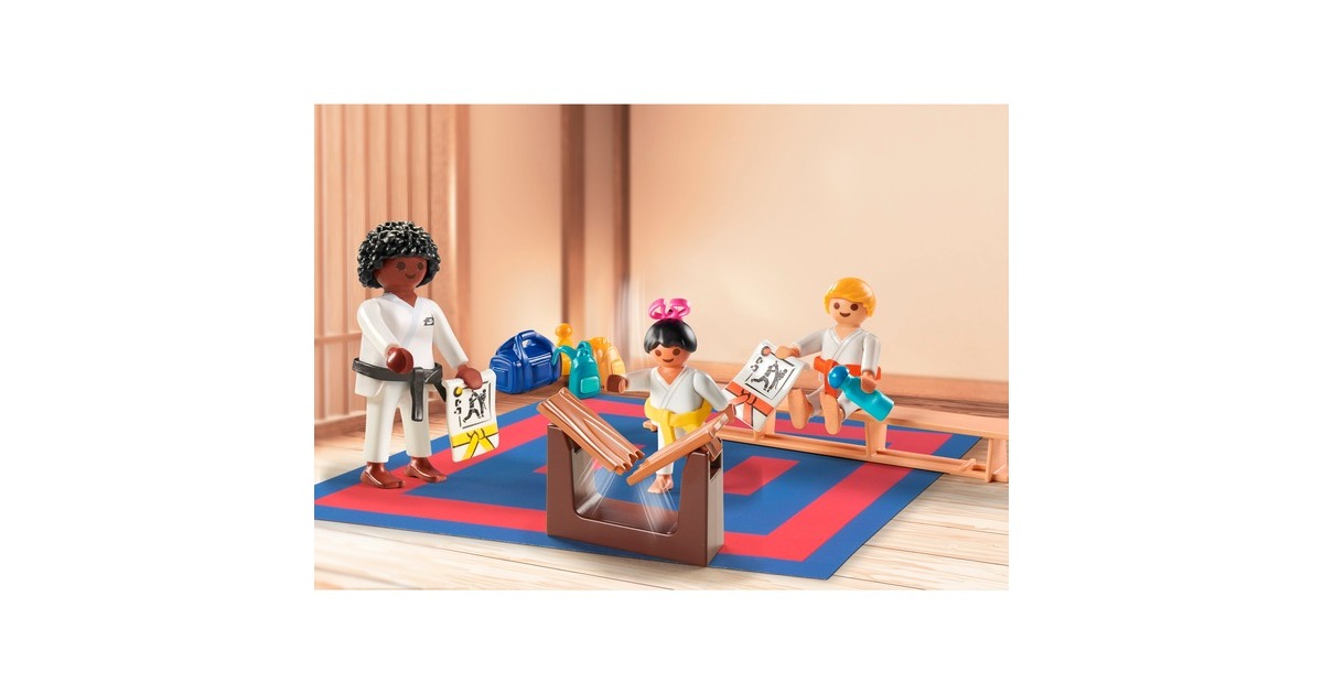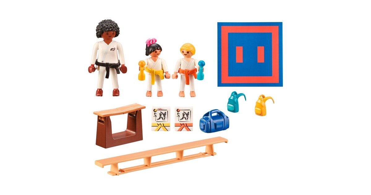 Figuren: 1 Karatelehrerin, 1 Karateschülerin, 1 Karateschüler; Zubehör: 2 Trinkflaschen, 2 Urkunden, 2 Rucksäcke, 1 Schlagbrett, 1 Tasche, 1 Langbank |