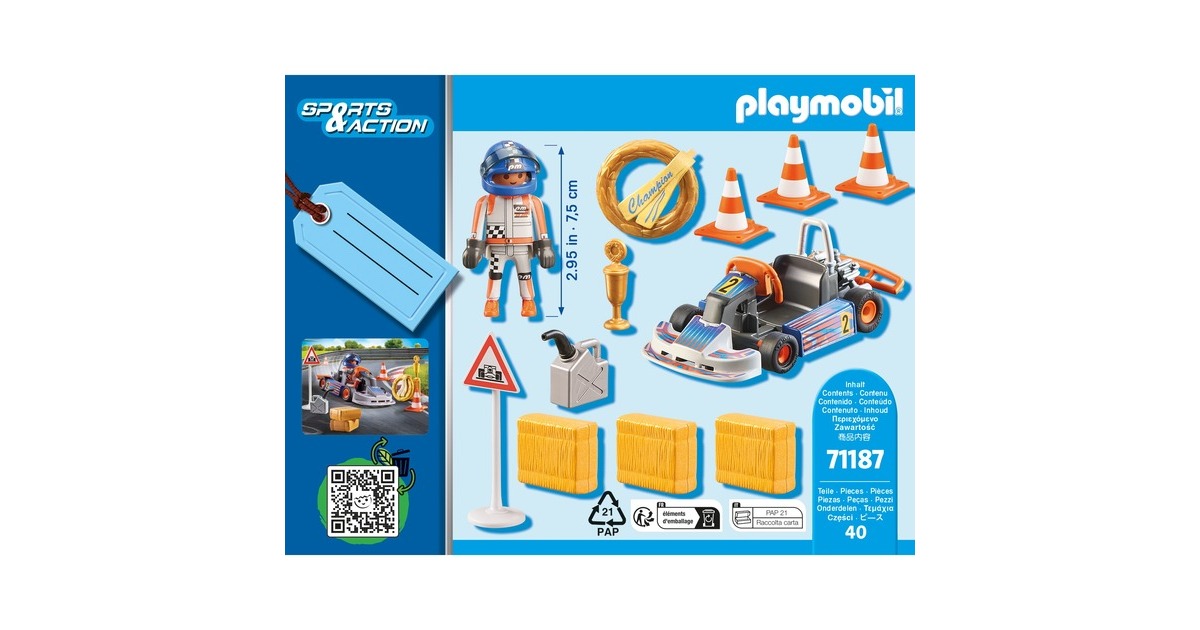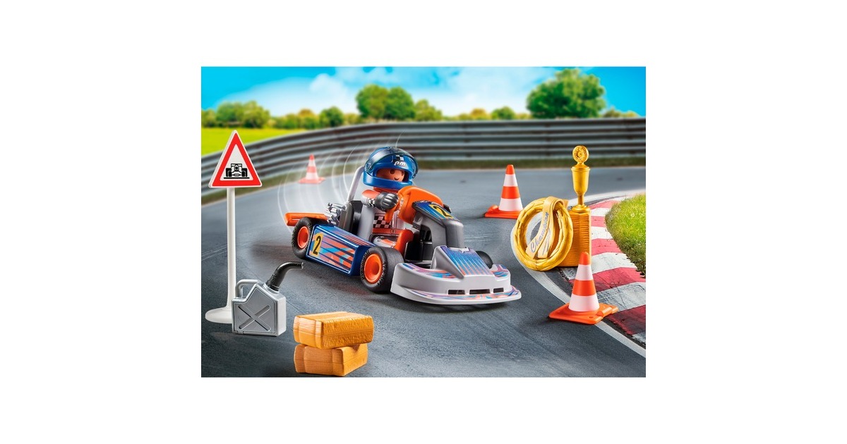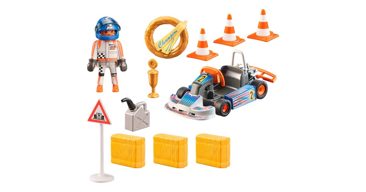 Figuren: 1 Rennfahrer; Zubehör: 1 Kart, 1 Pokal, 1 Siegerkranz, 3 Pilonen, 1 Helm, 1 Benzinkanister, 1 Warnschild, 3 Strohballen |