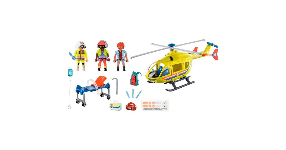 Figuren: 1 Rettungspilot, 1 Rettungscopilotin, 1 Verletzte; Zubehör: 1 Rettungshelikopter, 1 Krankentransportliege, 1 Infusion m. Infusionsschlauch, 1 Set Erste Hilfe Instrumente, 1 Rucksack, 1 Verbandstasche, 1 Verbandskoffer, 1 Etikettenbogen mit Verbandmaterial, 1 Helm m. Mikrofon, 1 Schirmmütze, 1 Kopfhörer, 1 Armbanduhr |
