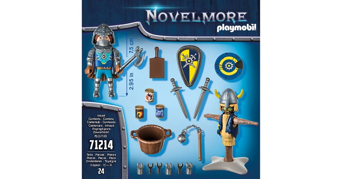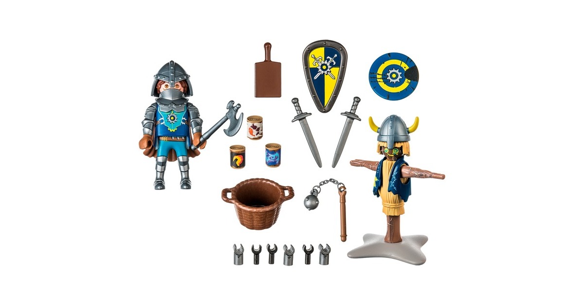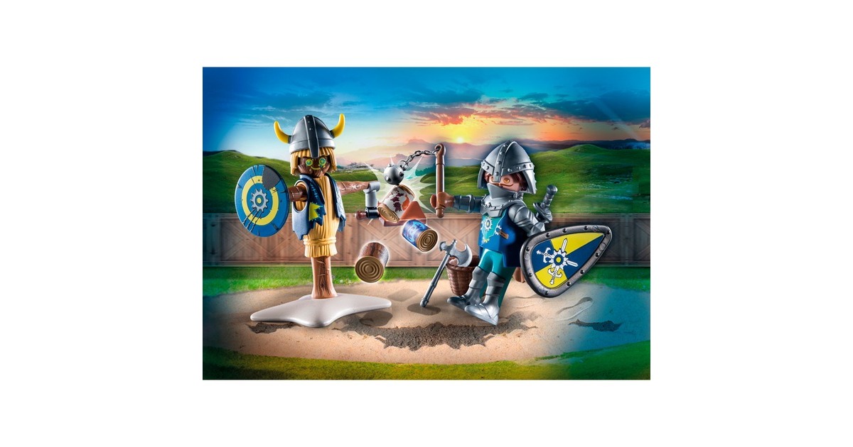 Ein echter Ritter muss viel trainieren. Das weiß auch Novelmore Ritter Bruce Benett und macht sich deshalb mit Schwert und Schild fleißig ans Werk. Sein Trainingspartner ist eine schweigsame Stechpuppe. Für die Übungen werden verschiedene Waffen, ein Schild oder ein Brett an den Holzarmen der Puppe befestigt. Anschließend versucht Bruce die einzelnen Holzscheite mit dem Schwert abzuräumen. Dank seines ausgiebigen Trainings ist der mutige Ritter stets auf jedes Abenteuer vorbereitet. Mit raffinierten Funktionen und interessanten Charakteren lädt die Novelmore-Spielwelt zu aufregenden Ritterabenteuern ein. Toller Spielspaß für Kinder ab 4 Jahren. Produktdetails: Das 24-teilige Ritter-Spielzeug besteht aus einer PLAYMOBIL-Figur, zwei Schilden, zwei Schwertern, einer Stechpuppe, einem Morgenstern und weiteren tollen Extras. Die enthaltenen Helme können sowohl der Übungspuppe als auch dem Ritter aufgesetzt werden. Dieses Set kann einzeln bespielt oder mit den anderen Ritter-Spielzeugen der Novelmore-Spielwelt kombiniert werden.