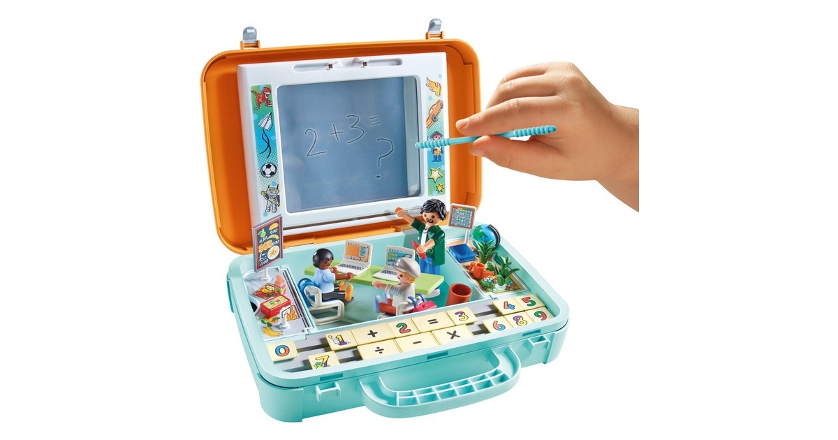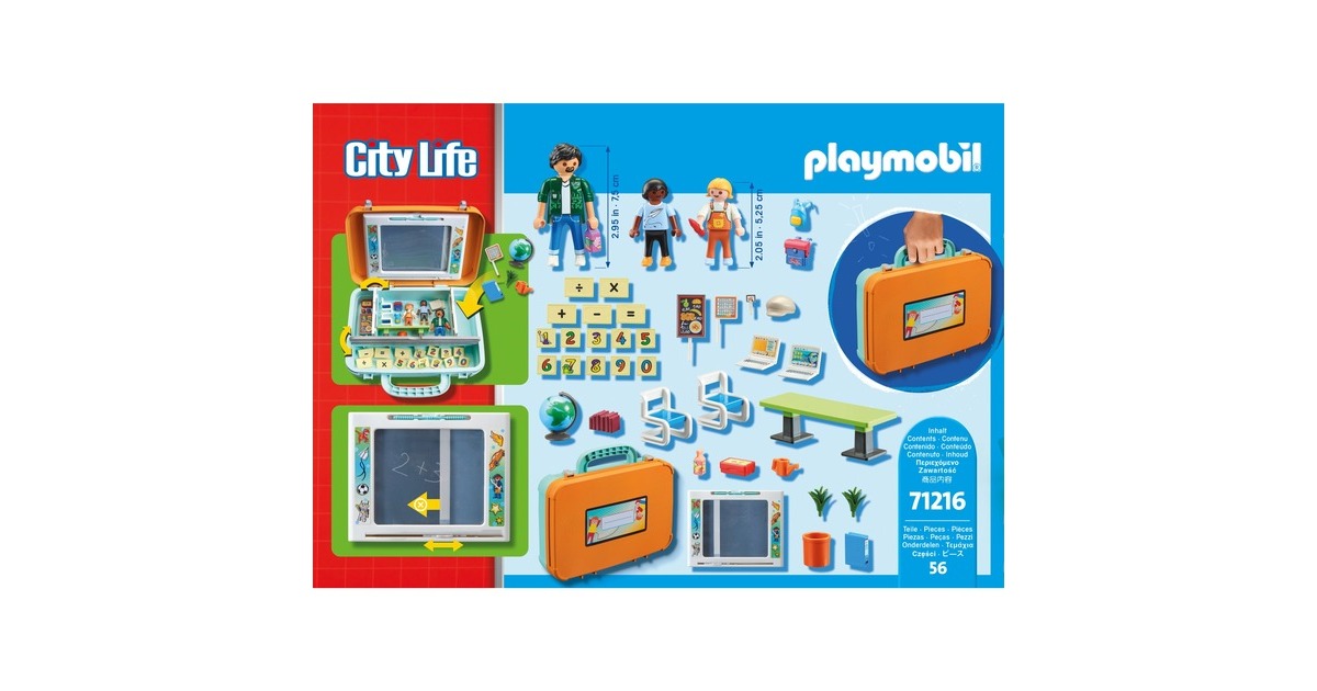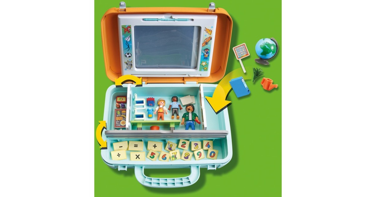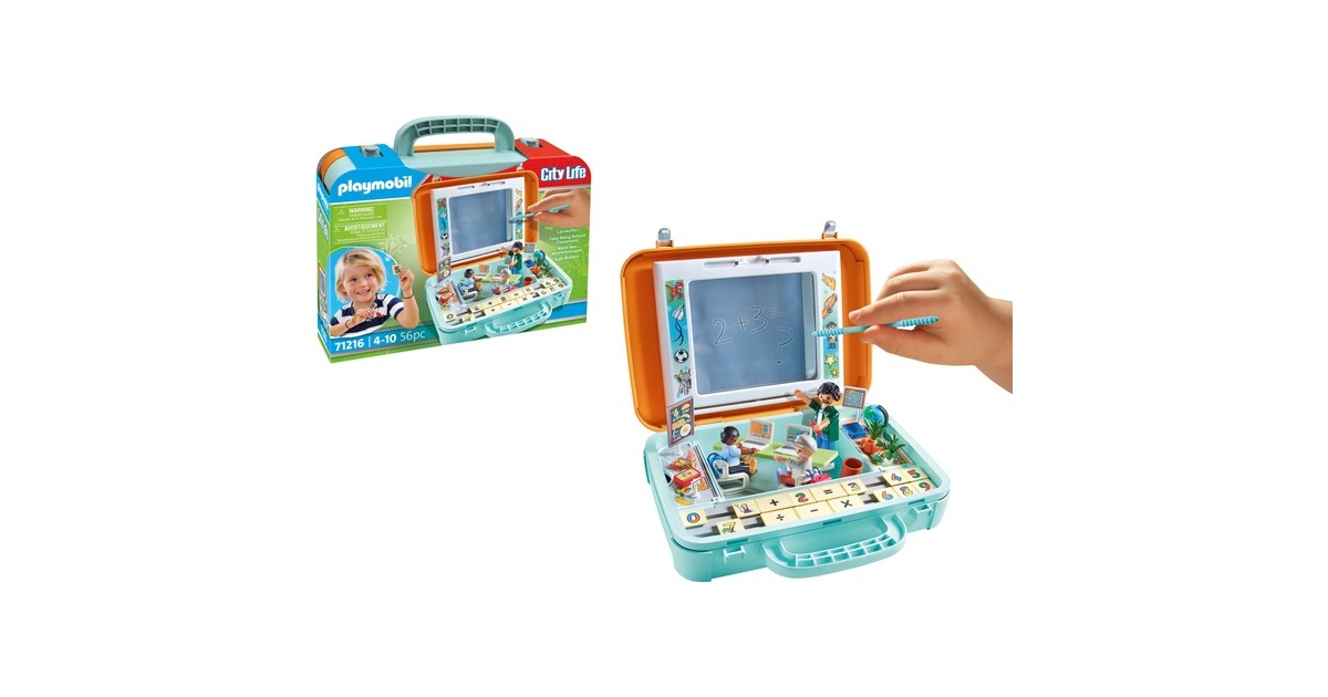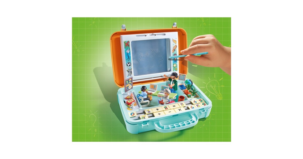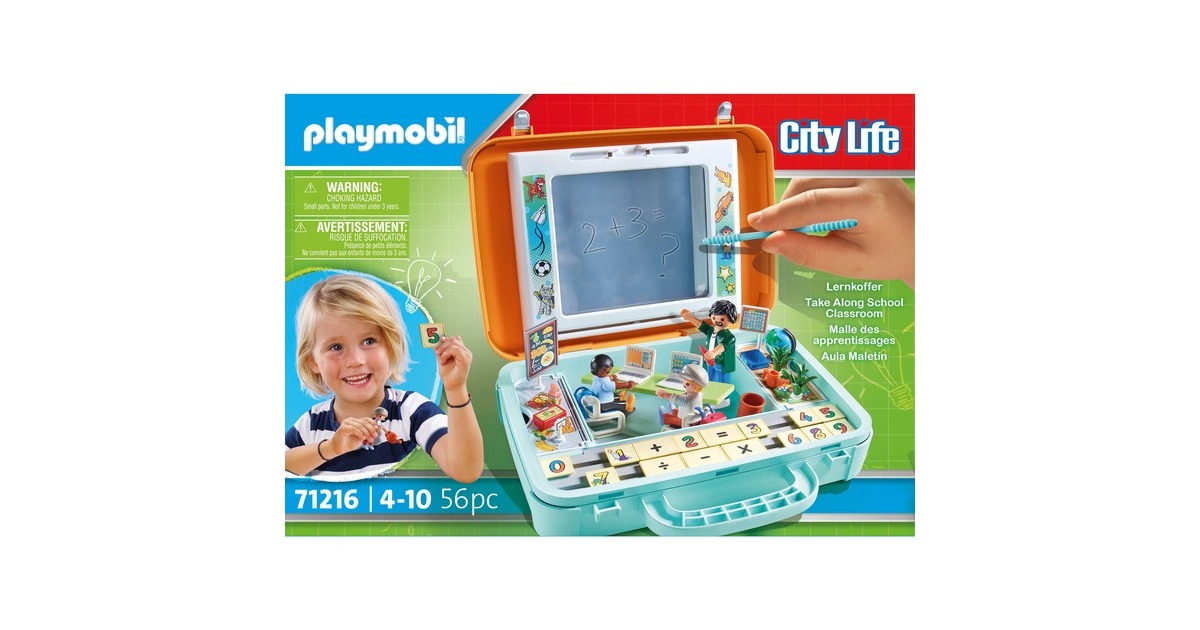 Der Lernkoffer aus der Serie PLAYMOBIL City Life ist ein vielseitig einsetzbares Spielset für Kinder zwischen 4 und 10 Jahren - zum Mitnehmen oder für den Einsatz im Kinderzimmer. Im Koffer enthalten ist ein kompletter PLAYMOBIL-Klassenraum mit zwei Kindern, Lehrer und jeder Menge Zubehör. Mit den ebenfalls enthaltenen Rechenplättchen und der löschbaren Tafel mit Stift können Kinder außerdem selbst aktiv werden und ihr Wissen im Bereich Zahlen und Rechnen erweitern. So wird Spielen zum Lernerlebnis! Alle Teile finden problemlos im Koffer Platz, so dass das Set überallhin mitgenommen werden kann.Art.-Nr.: 1913242